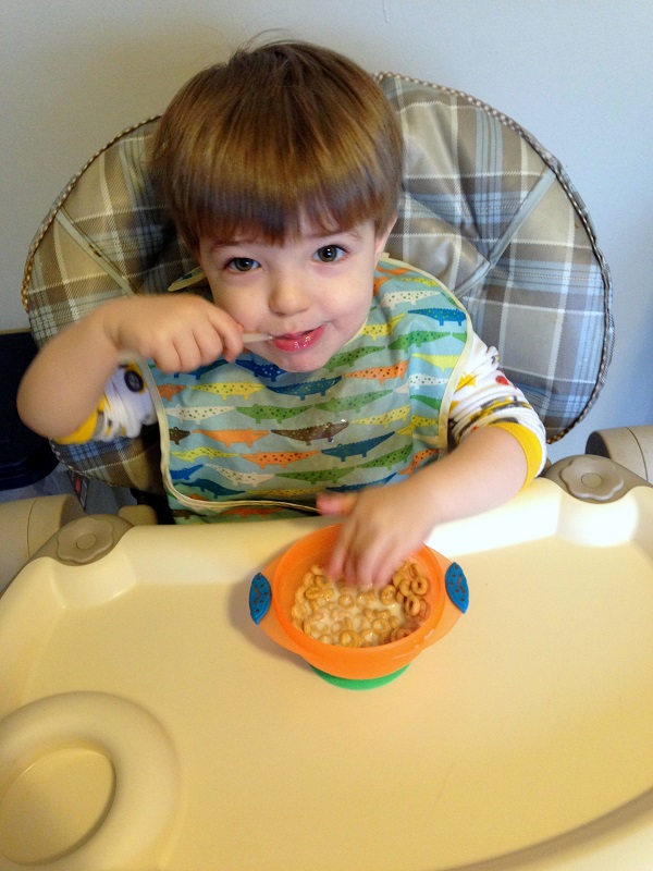 Eating: He’s still not a great eater, though he did eat some eggs and sausage on occasion. His list of food hasn’t grown any. All fruit, plain yogurt, cereal, oatmeal, cheese, crackers, peanut butter, bread, cottage cheese, pouches, smoothies, muffins, pancakes, mac and cheese. One night though, he ate a pea, small piece of broccoli, and licked a carrot – that was huge! He also started eating cheese pizza, and much to Lo’s chagrin (because he has to share his pizza) – he can eat A LOT of pizza…like 2 or more pieces! He loves cereal. It’s usually a mix of cheerios and kix. He still falls asleep eating lunch every now and then – no complaints here…it makes it easier to put him down for a nap.