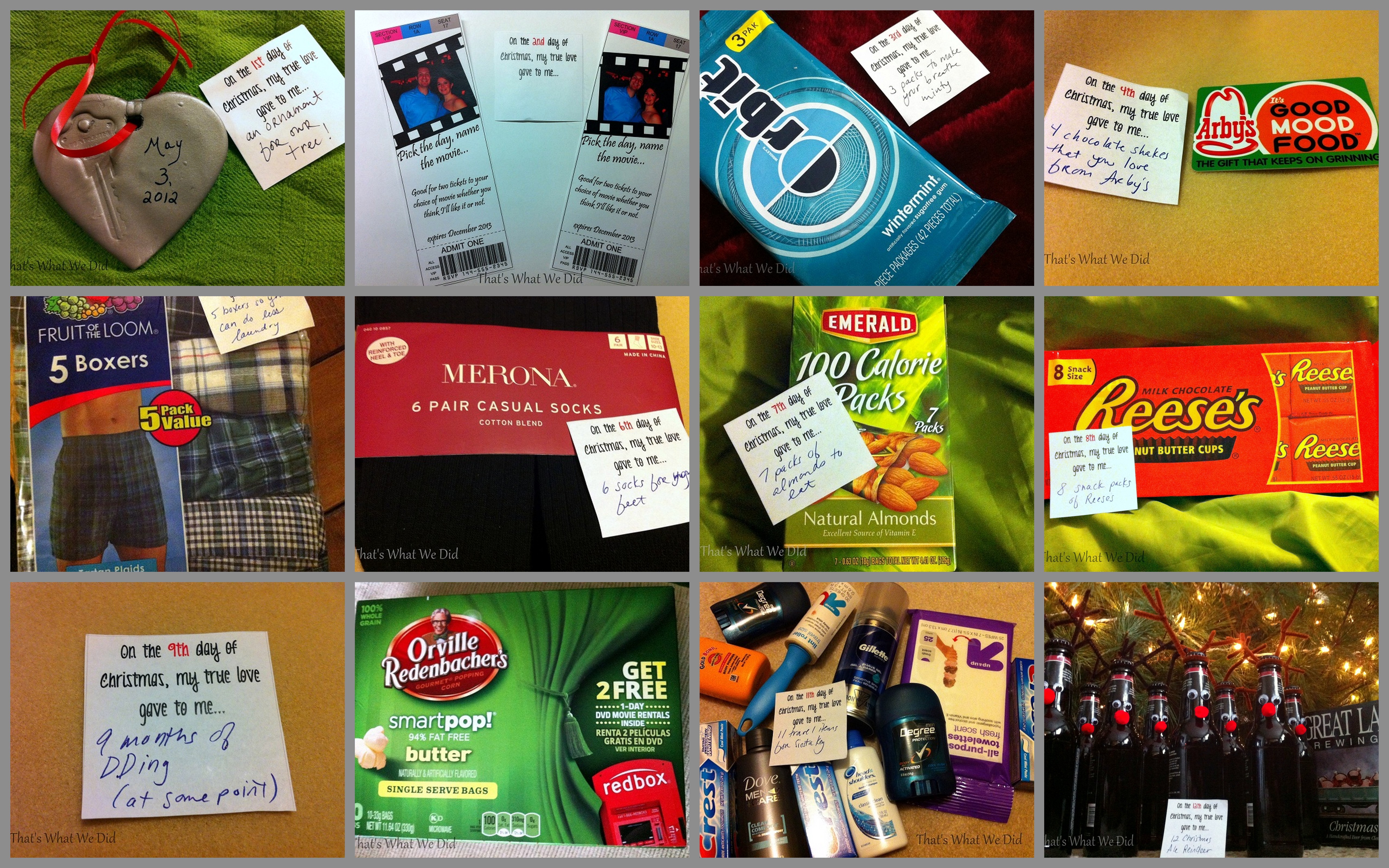 Lo was really surprised, in the beginning especially. And then he was kind of confused. And then he felt bad because he didn’t have presents for me. I kept reminding him that it’s not about how many presents and that I just wanted to do this for him. Plus, most of the items were inexpensive, homemade, or things that he would have bought himself at some point anyway. He kept saying – I don’t have 12 things for your stocking. I just told him that I wouldn’t have 12 for his stocking either because some of this stuff would have been in his stocking. And then he totally surprised me by putting this beautiful ring in my stocking that he had ordered prior to this 12 days business, by the way – and I was the one who felt bad for putting more silly stuff in his stocking. But we needed to remember that Christmas gifts aren’t about how many or how much – it’s about the thought. Here are the 12 days of Christmas gifts: