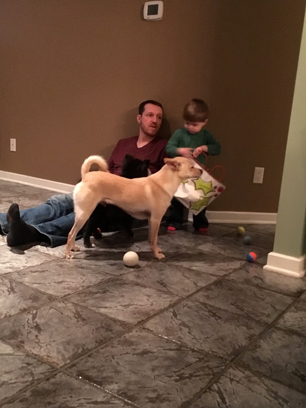 That night, we headed to our friend’s house for Christmas Eve. We’ve celebrated Christmas Eve with them for several years in a row, so it was great to get to do that again this year, especially since they’ve been in Florida since early fall and we’ve missed them! Jenson loved watching their fish and playing ball with the dogs. He had so much fun. They spoiled him with lots of gifts too…books, puzzles, slippers, an inflatable bed, and a few other fun things.