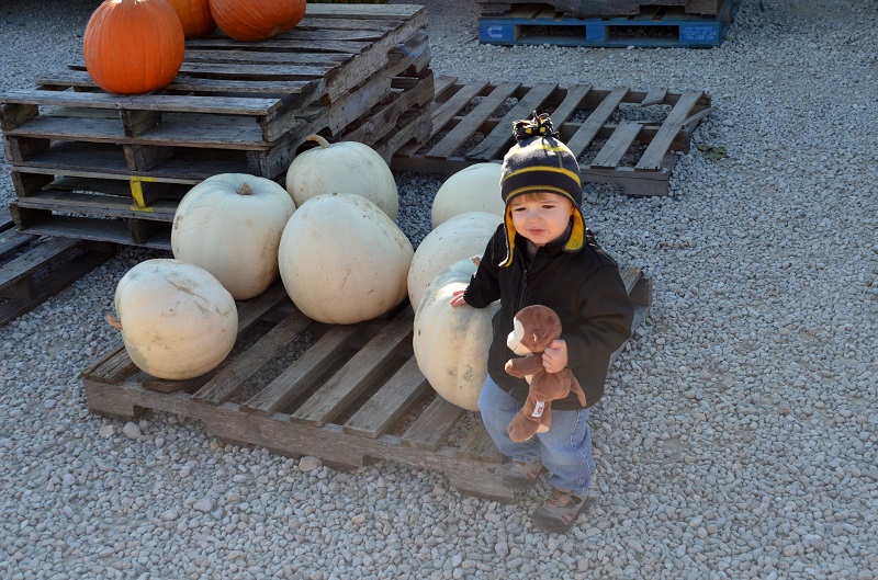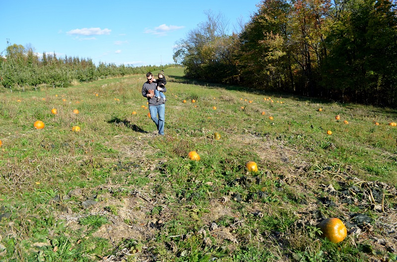 Since we bought over $20 worth of apples, we were allowed to pick a pumpkin from the patch for free. She told Lo where the patch was and that there weren’t many pumpkins left (due to the excessive rain in June hurting the crop), but failed to mention it was REALLY far away. It’s okay…it was a nice day, so a long walk was no big deal – and the property was gorgeous.
