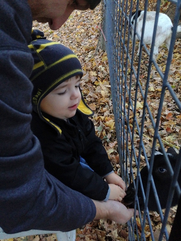 The sun was going down and it was starting to get chilly, so we went to say goodbye to the goats on the way to the car. The goats must have remembered Jenson, because they were very interested and poking their heads through the fence. Before we knew what happened, Jenson leaned in and kissed the black goat on the mouth to say goodbye. It happened too fast to get a picture, but it was so funny. We just were so surprised he did that – he loves to give kissed, but he doesn’t usually try to kiss animals.