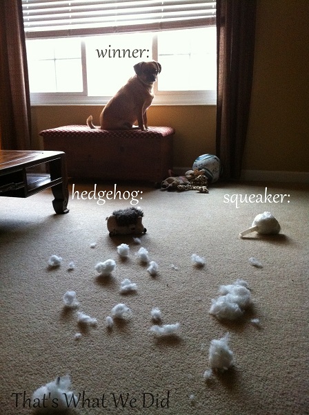 Boof won. I came downstairs and saw the destruction and she was looking at me like she was going to be in such trouble (like when she gets into our bags and such). Our friends gave her this hedgehog toy when we visited over the weekend and she LOVED it. But the squeaker was tormenting her!