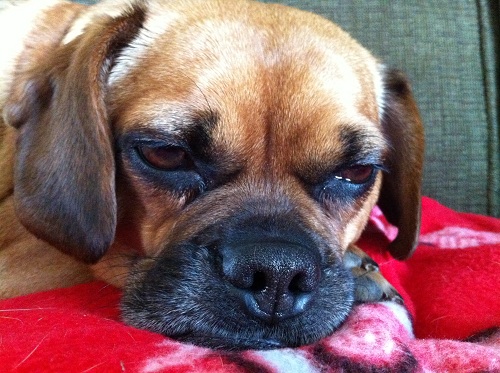 Boof was not fond of the shelf hanging process on Sunday. She seemed to think that because I took a bunch of clothes out of the closet and put them on my bed that we were packing for a trip. When we went to Siesta Key the last time, I had to get my summer clothes out, so I had a bunch of clothing spread out on my bed, so she thought that’s what was going on again. She was acting all nervous and sad. I don’t know how to reassure her that we aren’t leaving! Poor thing – she was abandoned twice and put in the pound, and then in a few different foster homes – she still doesn’t seem to understand that we are keeping her forever! And I still maintain that the people who abandoned her had to be total ASSHOLES because she is such an amazing dog. She is SO good and so sweet and she really asks nothing of anyone other than 2 square meals (and hopefully a couple of pieces of carrots as snacks). We leave her out when we are gone all day at work and she’s never had an accident – even when we’ve gotten home 2 hours later than normal. She’s still acting a little sad, but hopefully by the weekend she’ll realize we aren’t going anywhere. Seriously, sad-faced McGee here…