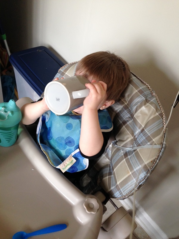 - “Jenson’s coffee” Since mommy and daddy drink coffee, Jenson decided he needed some too, so Lo put his milk or cereal in a mug for him.