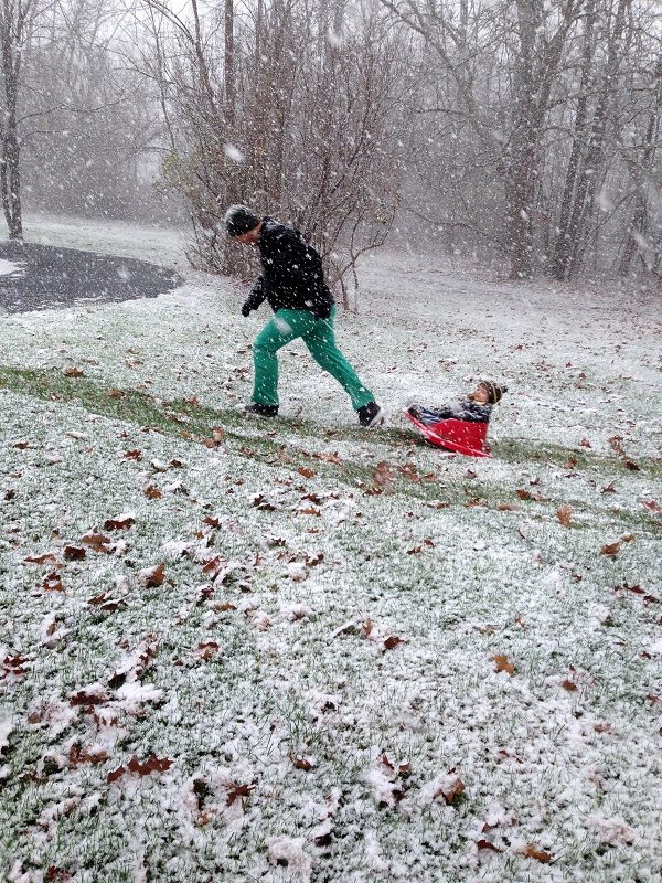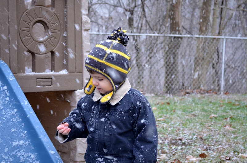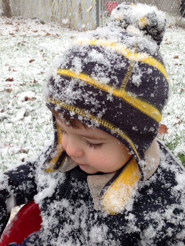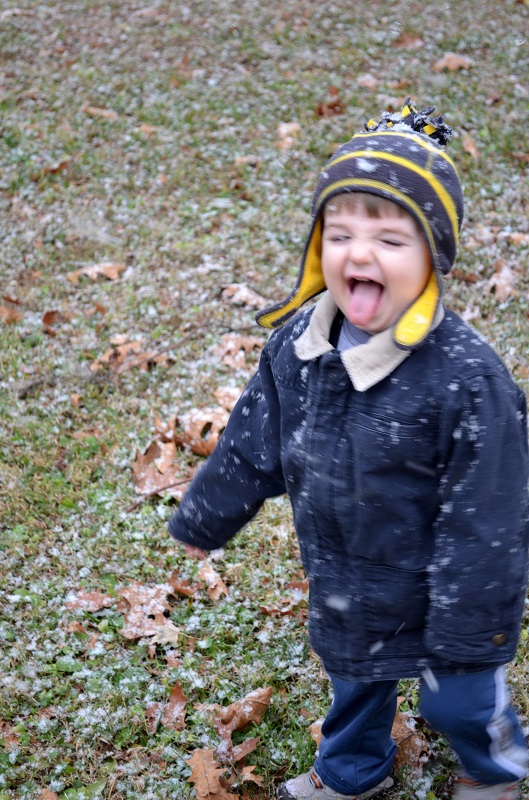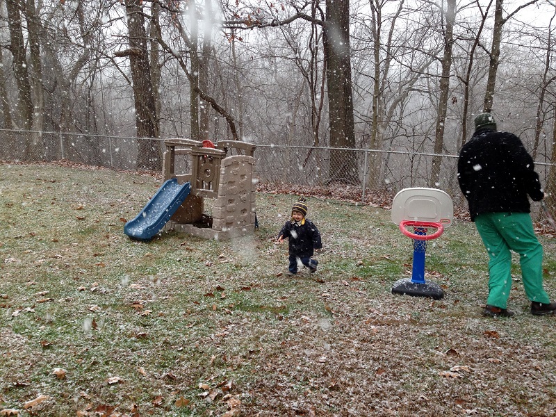 The Sunday before Thanksgiving, it started snowing a bit in the late morning, so I suggested we go outside while it was still sticking. We didn’t think it would last more than a few minutes, but it kept coming and probably continued for about 30 minutes. They ran around in the backyard for a bit (I went back in and got him gloves) and tried to catch snowflakes on their tongues.