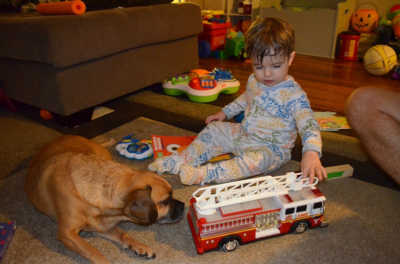We headed home and after dinner and a bath, he opened a couple of presents. The motorcycle was a hit, but the firetruck was “too loud” for him and he wanted it back in the box. I think he was just tired, and he’ll love it soon enough. We didn’t have cake – we’re having a little party for him on Saturday, so it seemed silly to make cake for both days, since we’d only give him a little bit anyway. He doesn’t really get birthdays yet anyway. He told us happy birthday when we told him happy birthday. We talked about his birthday a few times through the day, and by the end of the day when we asked him whose birthday it was, he finally said “Jenson’s!”. But then he said “Gannon’s!” (his cousin…whose birthday is actually Friday). So maybe he doesn’t get it.