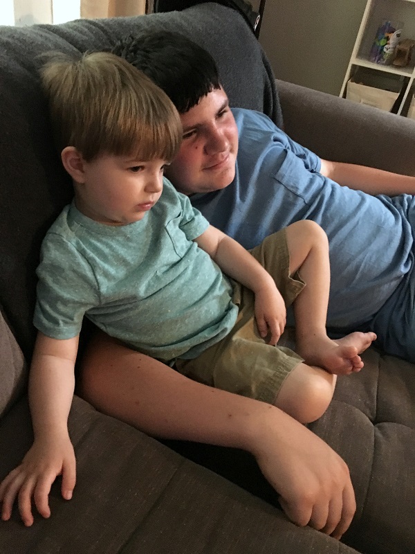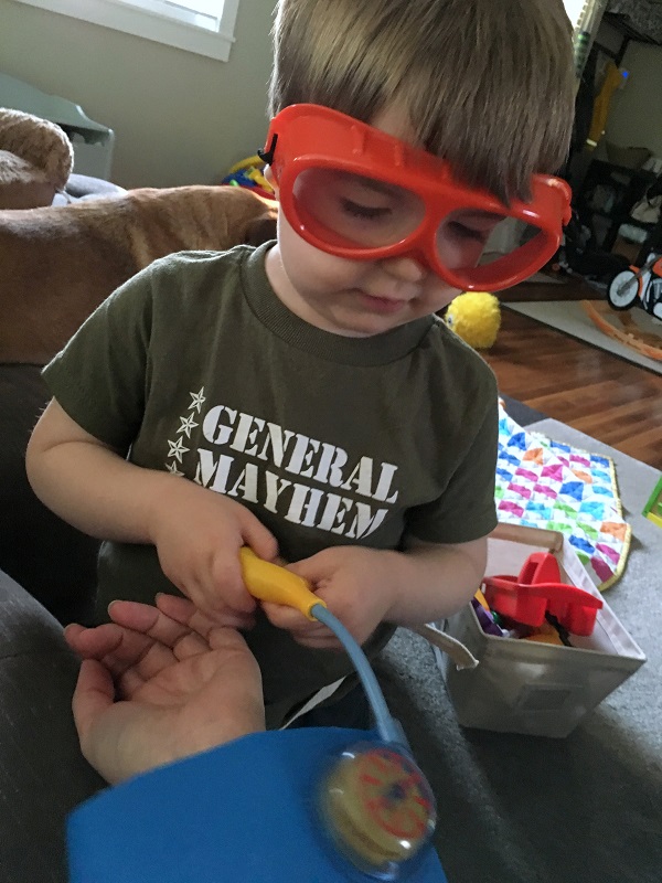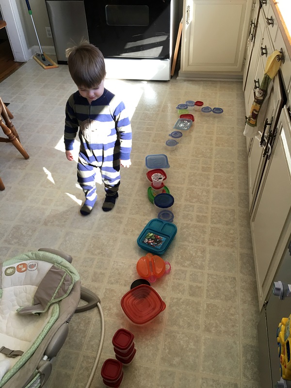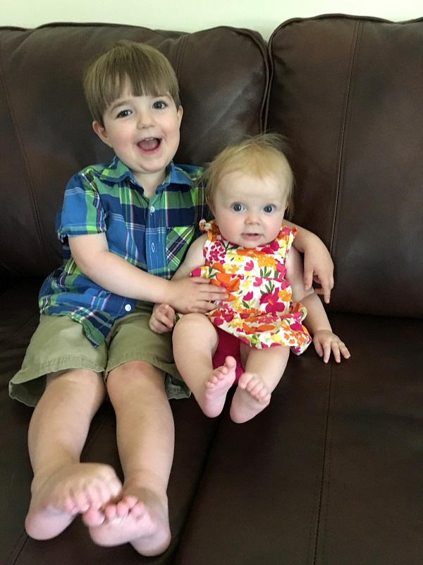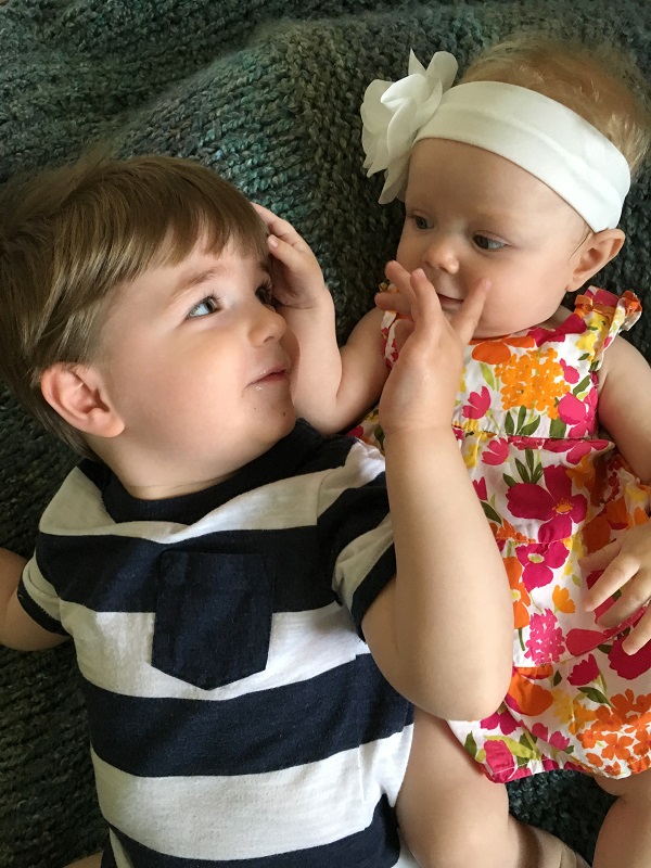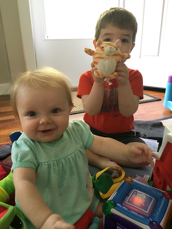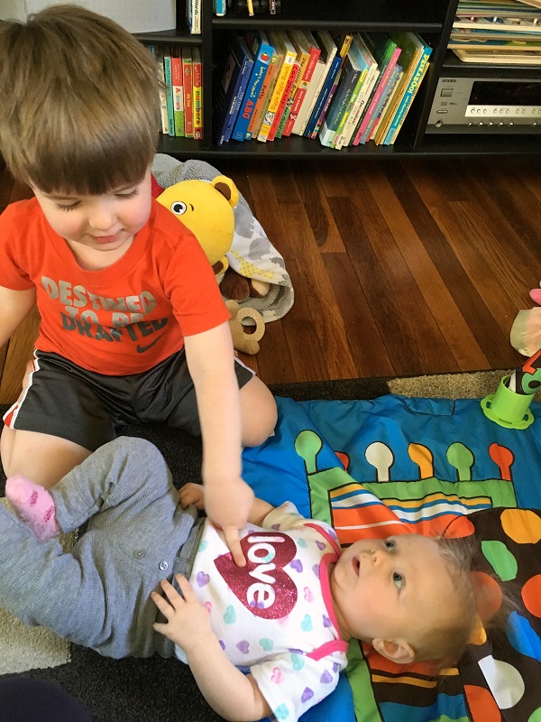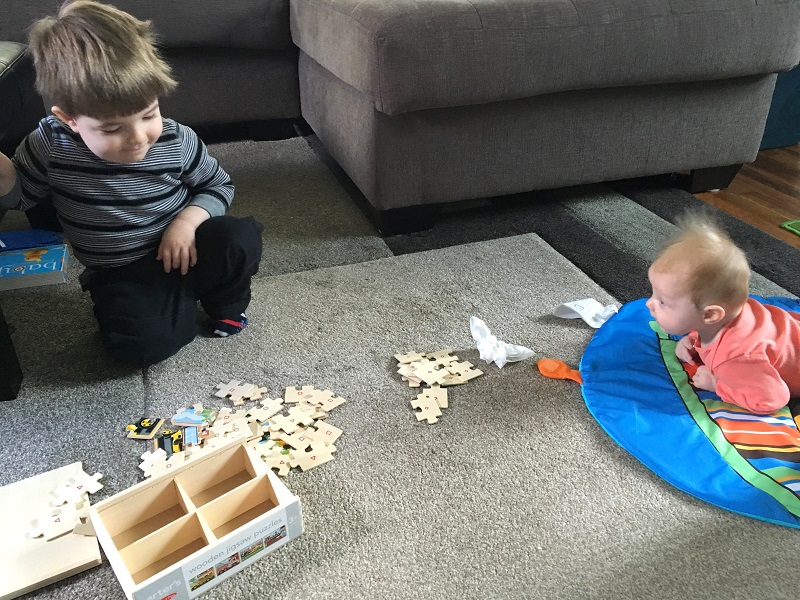 He’s a good big brother – he and Marlowe both adore each other equally. During this time, he’s become a little more jealous of her though. Now that she’s sitting up and playing, and to be honest – just more interesting and fun, he’s a little jealous when she’s getting attention. He doesn’t act out towards her, but he wants held and carried more often, and if I do anything to her (tickle her, blow raspberries, lift her high in the air, or anything), he says “do that to me now”. He takes her toys still, but he’s learning that he needs to give her something else if he takes one from her. He’s very sweet with her typically, and will play with her, read to her, and talk to her.