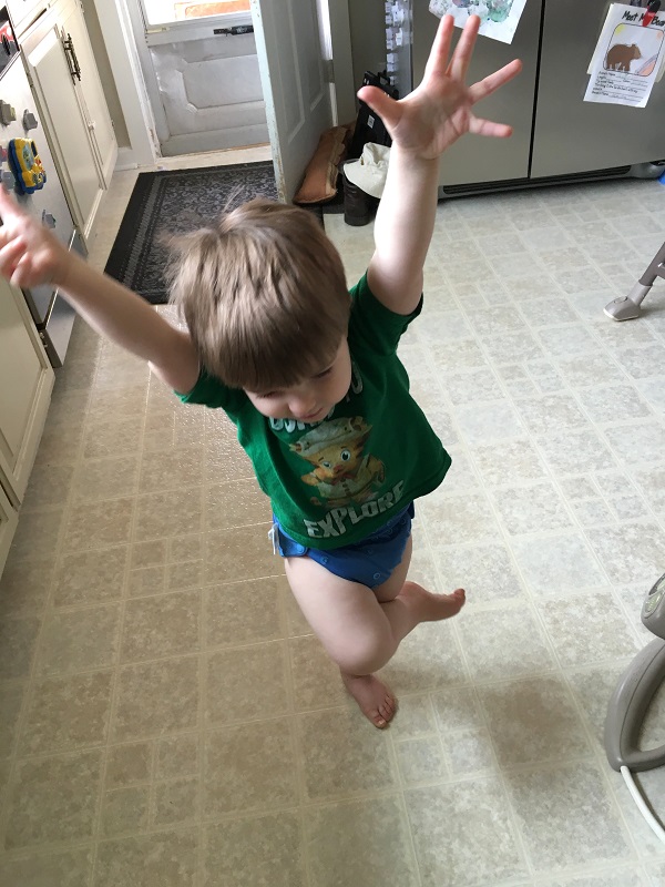 - Copying yoga poses – he loves “apple tree” which is actually tree pose