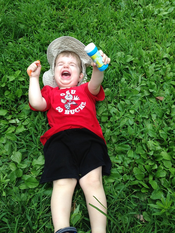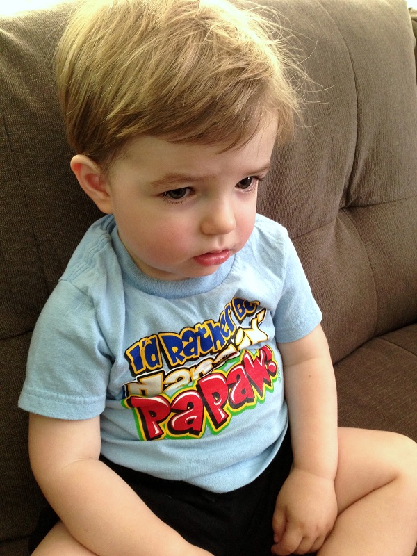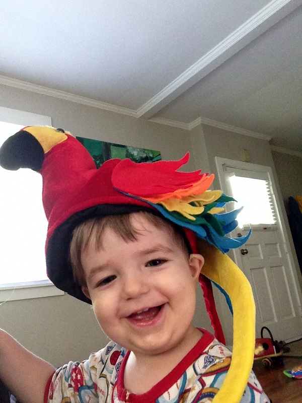 Word Up: He repeats almost everything that we say, and talks and sings constantly. He can count to 20 now – and will sometimes go a little higher if we prompt him. He counts objects – usually to 7-8. He knows his ABC’s and quite a few songs, including Twinkle Twinkle Little Star, the chorus of Peaceful Easy Feeling, words in Levon and Jesus Loves Me. He’s started to request Rockbye baby, and always asks it like a question. His animal noises have expanded to include most farm and zoo animals, and if he doesn’t know when we ask him one, he says “Ee ah” for the noise. When he wants to give me something (lint, food, whatever) he says “Here ya go, baby”. He usually will tell us when he poops and will lay down for us to change him. He’s getting easier to understand and is more communicative with us.