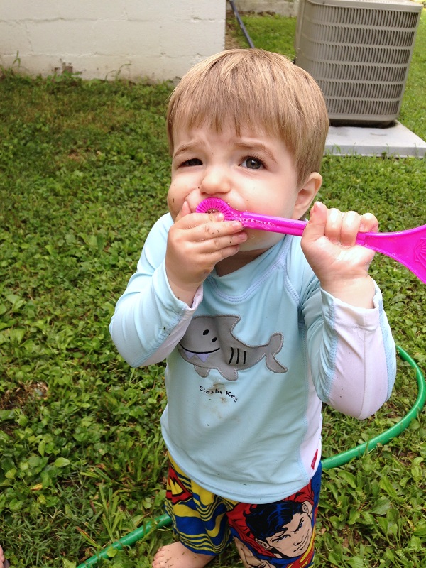 - Bubbles – he’s not good at blowing them…he just puts the wand against his mouth. I think he likes the taste!