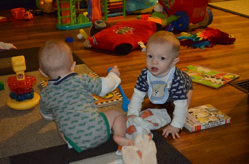 Sleeping: Sleep got a little worse this month.  We’d still put him in the crib (sometimes rocking first), and he wants us to keep singing to him.  He still always wants Rock-a-bye Baby (“Rockababy?”), but then I started a bad habit of substituting other animal and people names into the song in place of baby, so he likes it even more.  I couldn’t help it…I got tired of singing the same thing.  We still sit outside his door until he’s asleep because he’ll try to interact with us to make sure we are still there, and gets upset if he doesn’t get a response.  He’ll stand up in the crib and won’t lay back down until we poke our head in the door and tell him to lay down.  It takes an hour from start to finish.  Too long.
