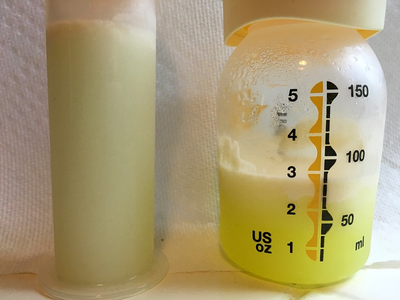 It wasn’t until Thursday when I looked at the bottles of pumped milk in the fridge did I notice the huge difference between milk pumped on Monday (on the left), and the milk pumped on Tuesday – right before she started exhibiting symptoms of a cold. The bottle on the right when she was first getting sick is so much more yellow and colostrum-like.
