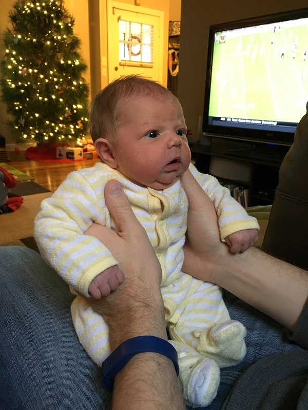 Marlowe is technically 7 weeks old, but I’m just going to capture the first month. Since I didn’t get to post much from that month, this post is going to be long and photo-heavy. She had a pretty busy month after we came home from the hospital on December 31. (I covered her birth story and our hospital stay in this post) On January 1, her first full day home, she had a blood draw to get the “all clear” for her bilirubin, she met Meemaw and Peepaw, plus she got to see the Buckeyes win the Fiesta Bowl! Since she was “born a Champion”, it was fitting.