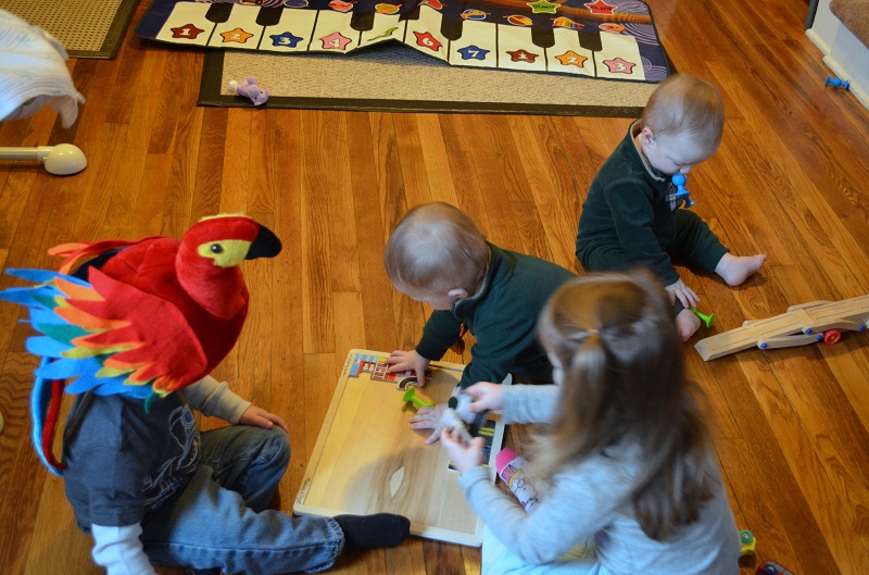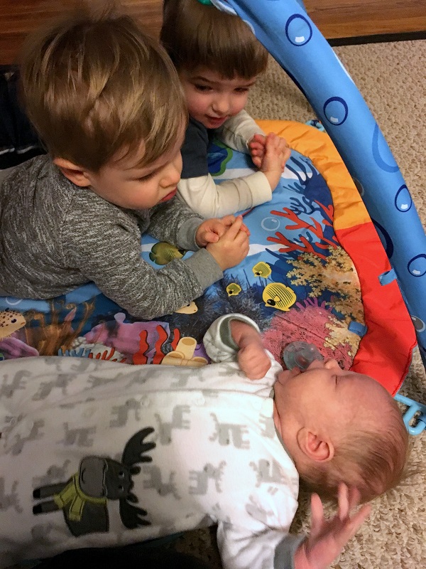 The following weekend brought Lo’s mom back to stay with us on Friday. She came to paint the window trim for the new windows we had installed in late December, but she helped out with the kids a ton, of course. Our friends Chuck and Kelley visited on Saturday and brought possibly the most adorable outfits ever. I’m so disappointed that I didn’t take a picture of them with Marlowe and/or Jenson! They’ll be in Florida for a few months, so we won’t get one for awhile. On Sunday, Lo’s sister’s family came to meet Marlowe. Do you want to see chaos? Put 5 cousins under 4 in the same room for a few hours. Marlowe was the most well-behaved of course, because she slept most of the time. Between Sadie and Jenson (who actually play really well together) and the twins (who are into everything and very ornery). It was busy, but fun. These cousins are going to have so much fun together as they grow up!