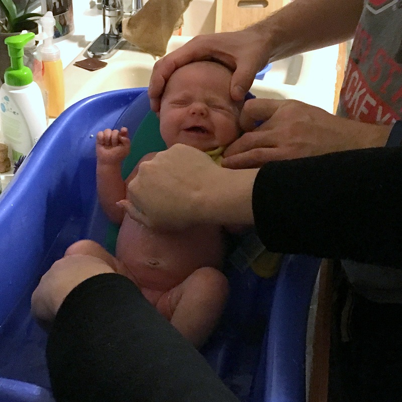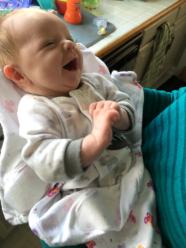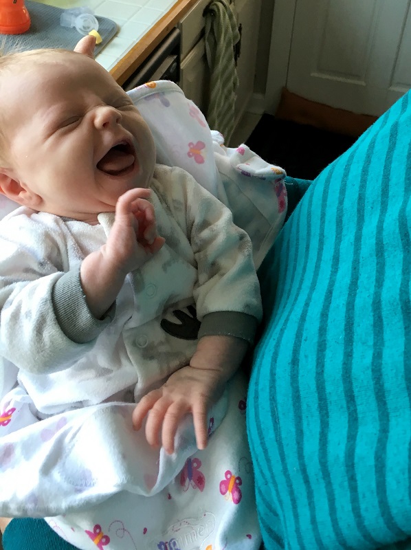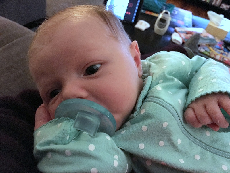 Eating: All breastmilk after the first few days. We had to supplement with a little formula for her first couple of days to flush the bilirubin from her system, but after that was cleared, we went back to just breastmilk. She was a fussy eater until we had her tongue and lip tie fixed at 2 weeks old, so sometimes we had to give her a little bit of pumped milk first, so she would calm down and latch better. She’s starting to get fussy and is spitting up more after nursing though – like she’s having gas or reflux, so I think we’ll probably have to get baby zantac for her.