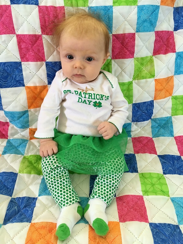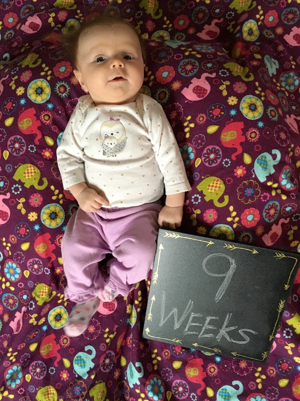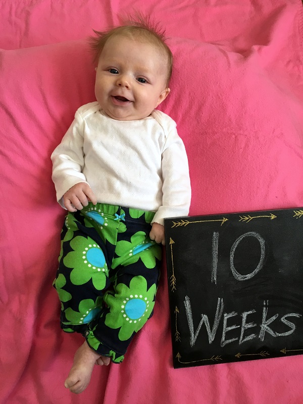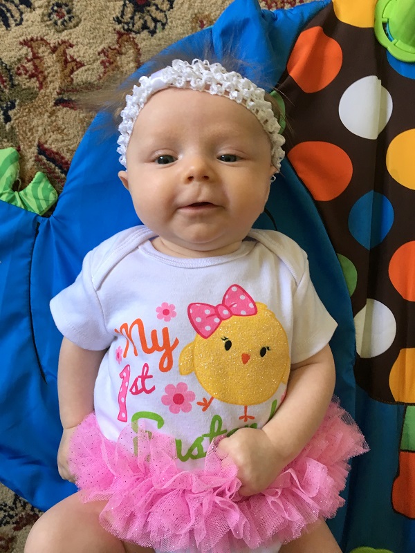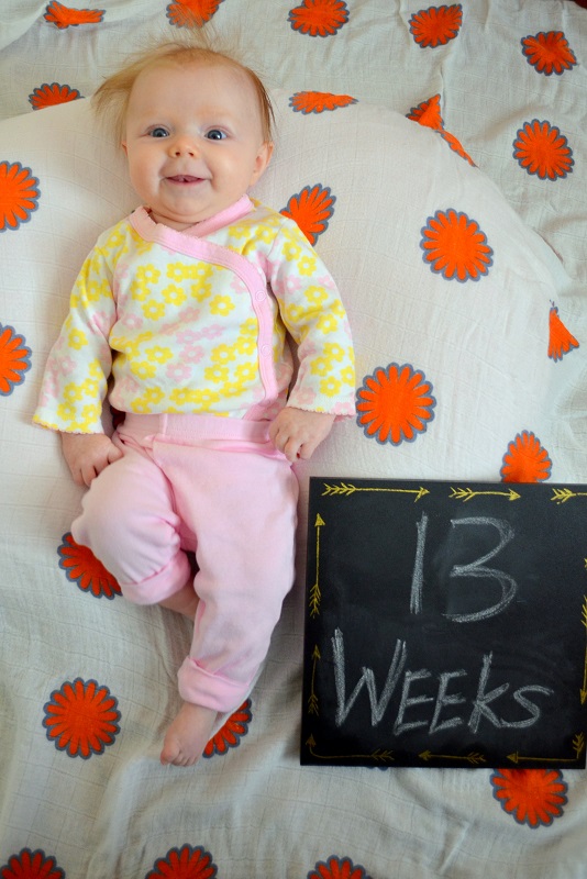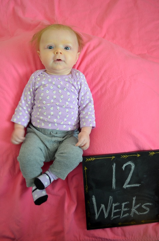 Temperament: She was less fussy this month, but she still wants to be held all of the time. She’s doing better at laying on her own on the mat or changing table for periods of time. She’s generally happy and smiley though – most of the time if you make eye contact with her, she smiles. When she’s fussing, she wants to eat or to sleep (and you better know which). She’s starting to find her voice and does a lot of squealing and cooing – she sounds so girly sometimes too.