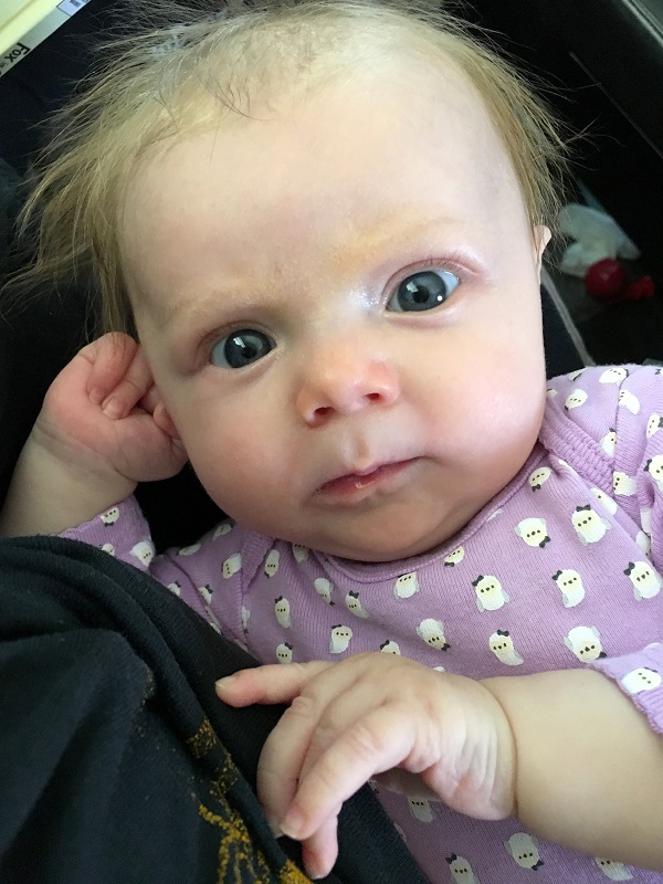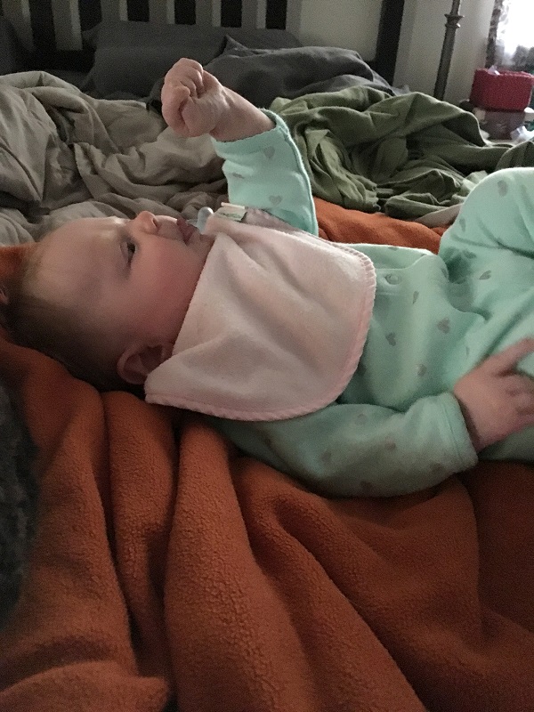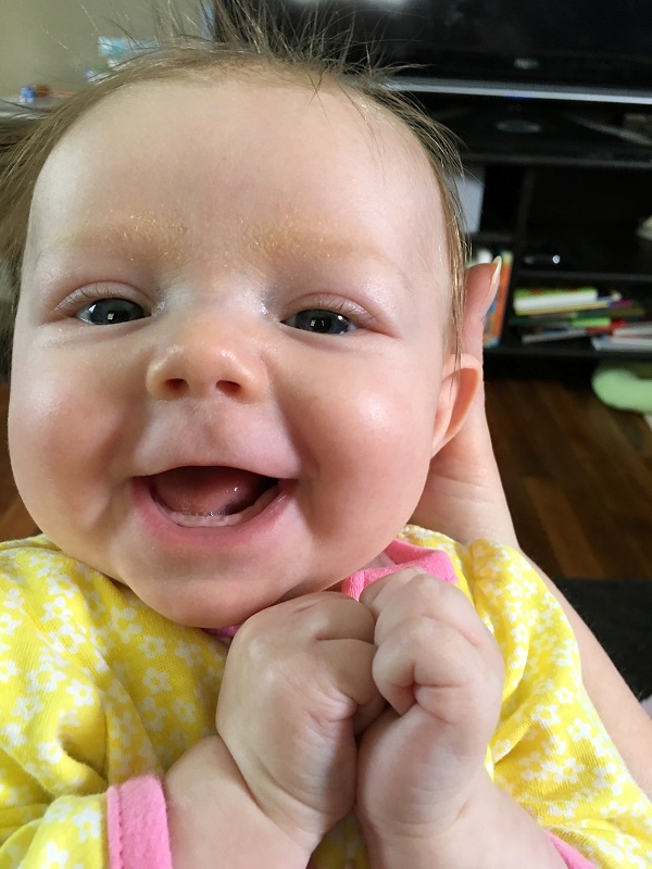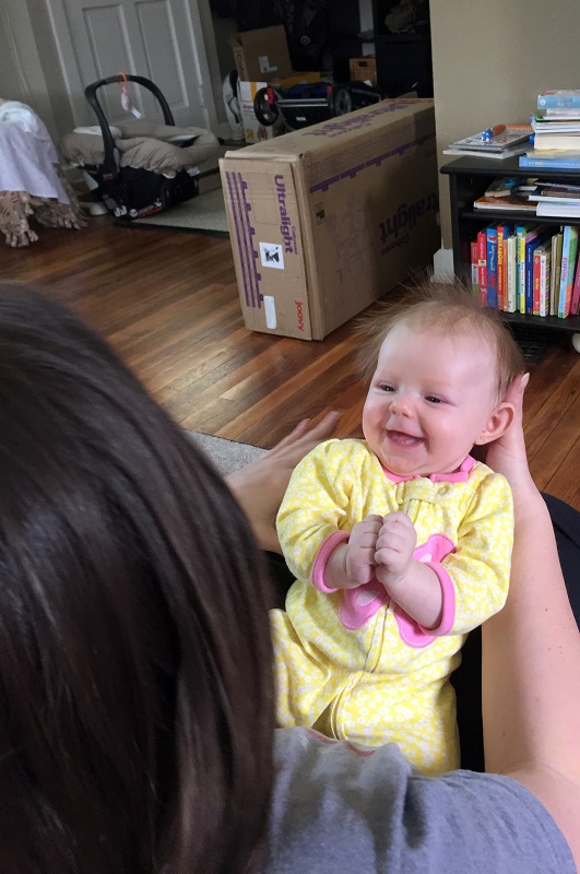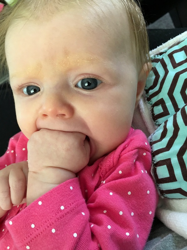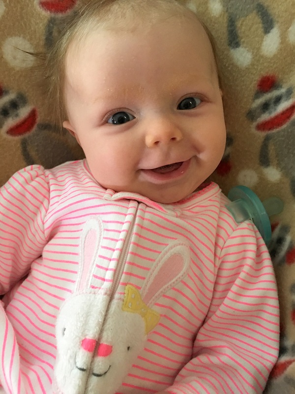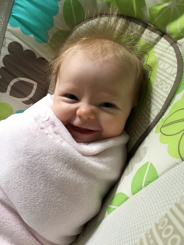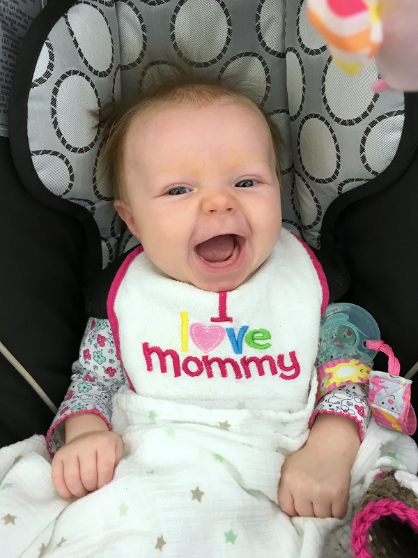 Sleeping: She’s not a good sleeper anymore, lol. I knew it would end, but I didn’t think it would be this soon. She now wakes every 2-3 hours, with no long stretch. Soooo…there’s that. She’s still in our room because we have to put her binkie back in constantly. She also doesn’t nap that well. She doesn’t take any naps longer than 45 minutes. She takes more naps than she should at this point – 6-7 times a day, but they are short. I haven’t figured out how to stretch them out so that she takes less. Even though we aren’t getting a lot of sleep, this is her face when she wakes up…and that makes it better.