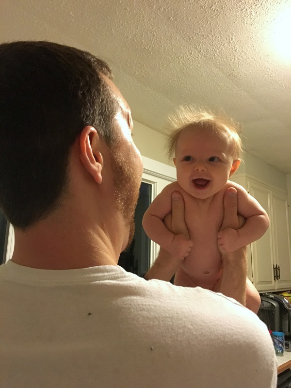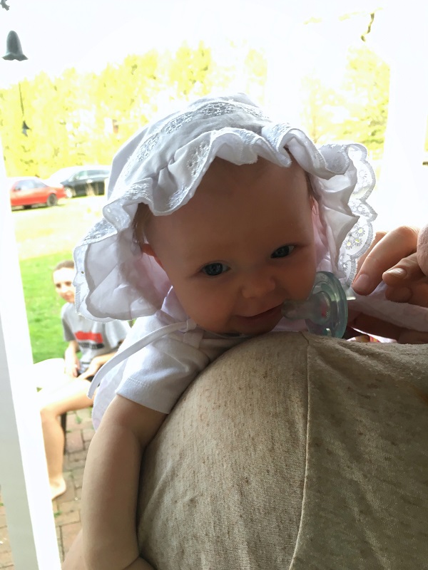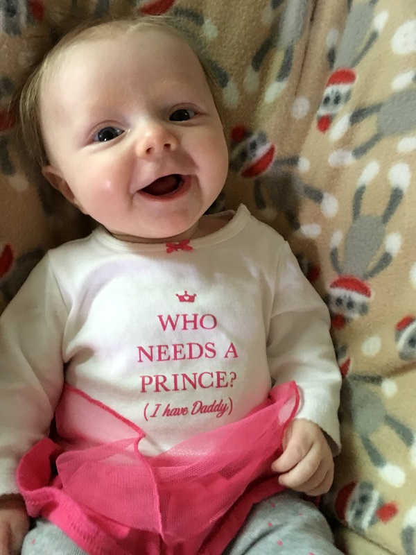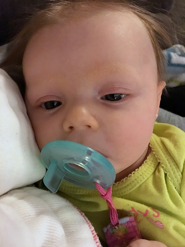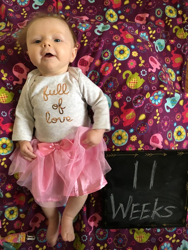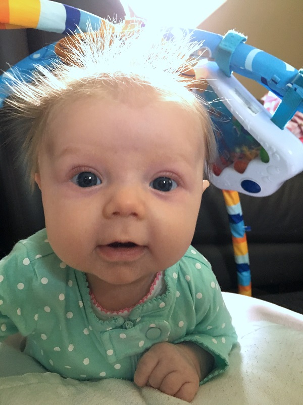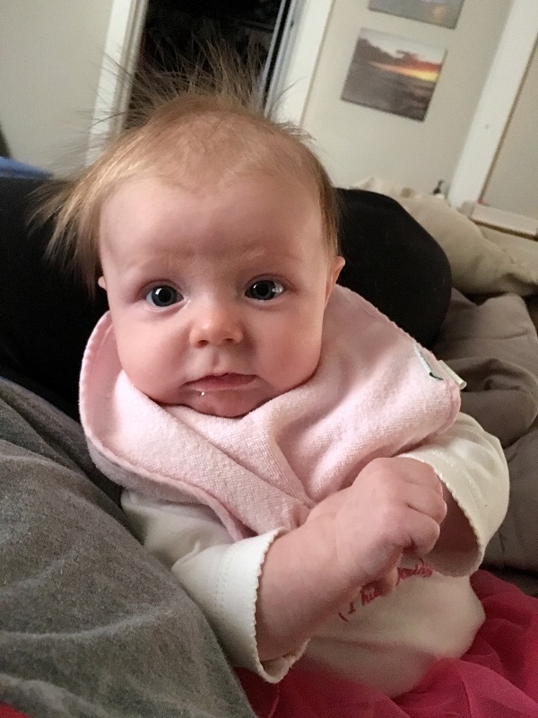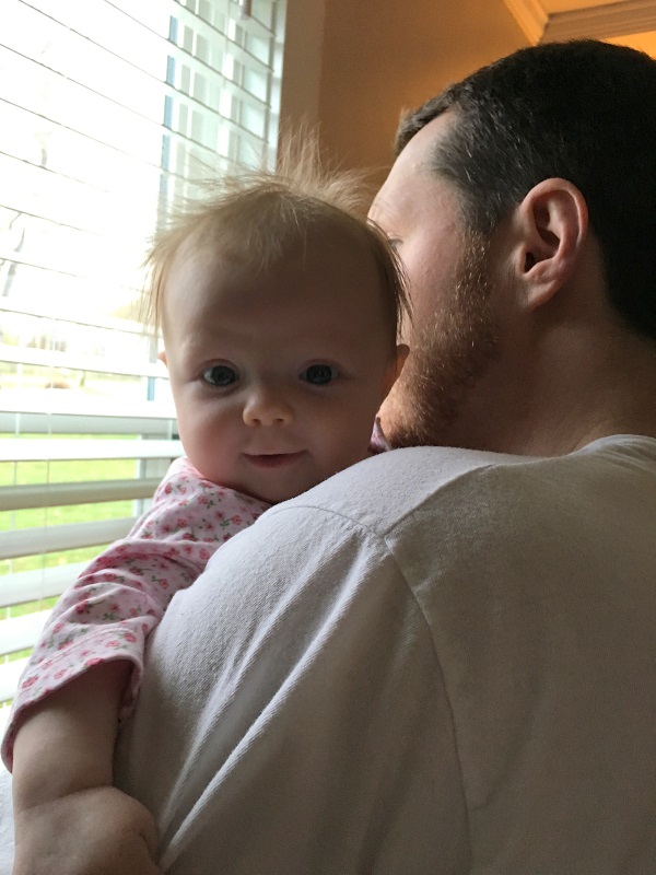 Sleeping: She’s not a good sleeper anymore, lol. I knew it would end, but I didn’t think it would be this soon. She now wakes every 2-3 hours, with no long stretch. Soooo…there’s that. She’s still in our room because we have to put her binkie back in constantly. She also doesn’t nap that well. She doesn’t take any naps longer than 45 minutes. She takes more naps than she should at this point – 6-7 times a day, but they are short. I haven’t figured out how to stretch them out so that she takes less. Even though we aren’t getting a lot of sleep, this is her face when she wakes up…and that makes it better.
