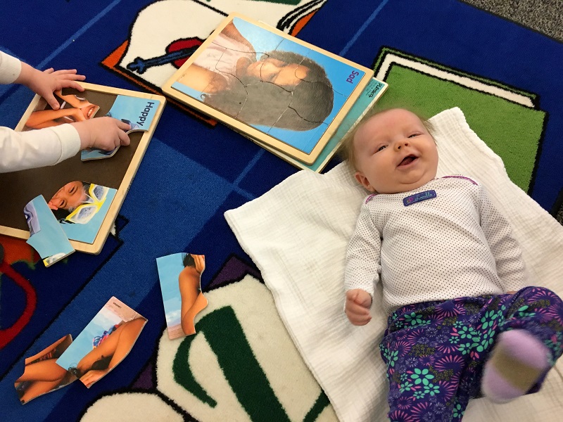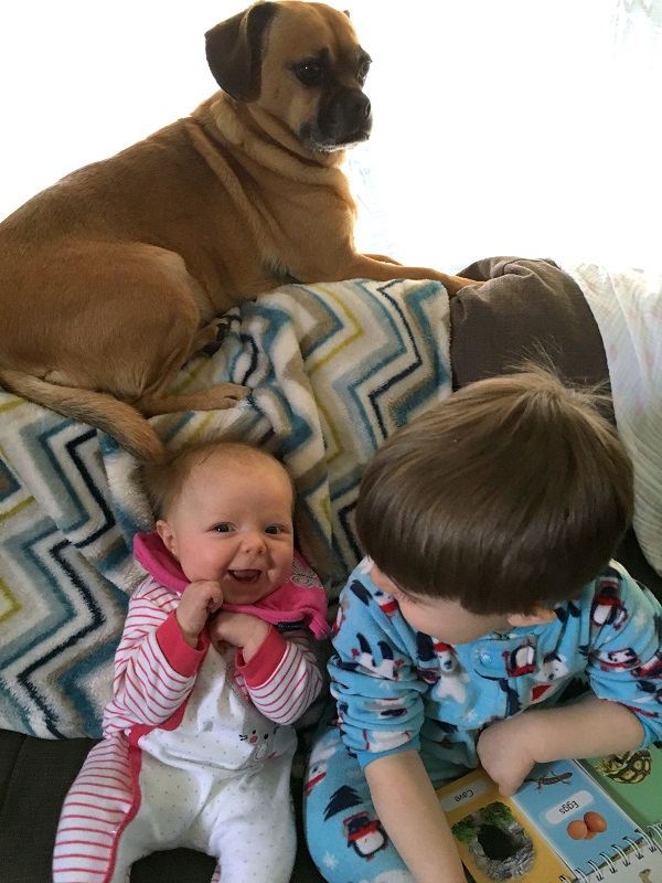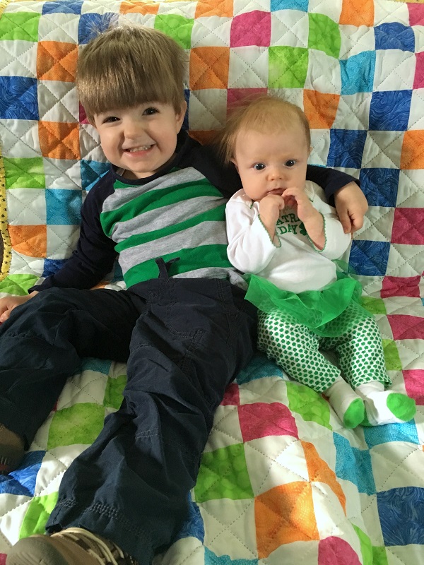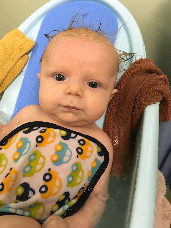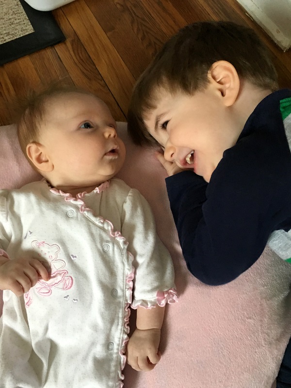 Movement: She discovered her hands this month and spend a lot of time holding her left hand up and staring at it. She also started batting and grabbing toys hanging down. She loves to kick her feet and has started slamming them down on the changing table like Jenson used to do. She doesn’t mind being on her stomach now – especially if she can watch Jenson play.