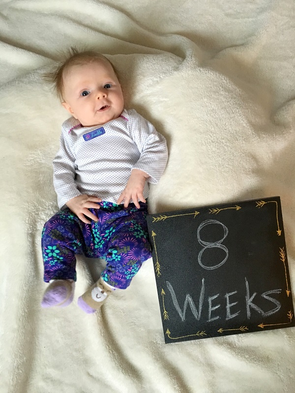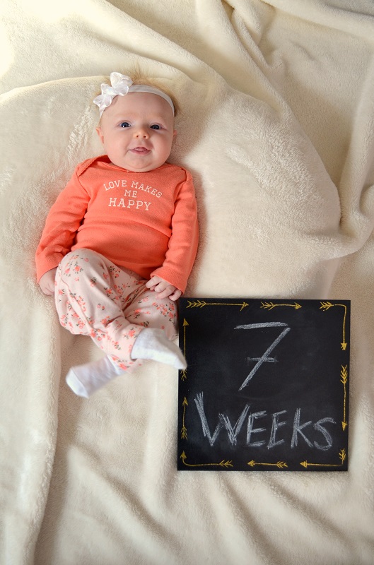 Movement: She’s starting to kick her legs on purpose when she’s laying down – especially if there’s something to kick against, like when I lean over the changing table. She likes to lay on her playmat usually and look at the lights. Her neck is really strong – everyone is always surprised. We don’t do a lot of tummy time with her, since she’s usually sleeping, wanting to eat, or has eaten to recently to be on her stomach without spitting everything up. But we hold her up and on our chests enough that she’s really strong. When we put her in tummy time, she can hold her head up for a few minutes at a time and doesn’t get too upset.