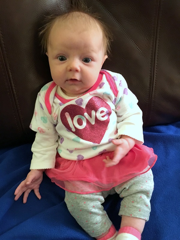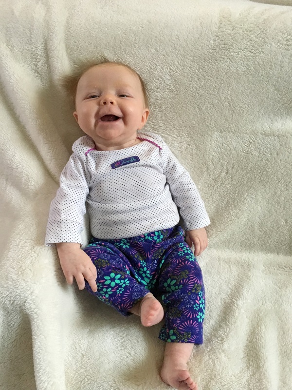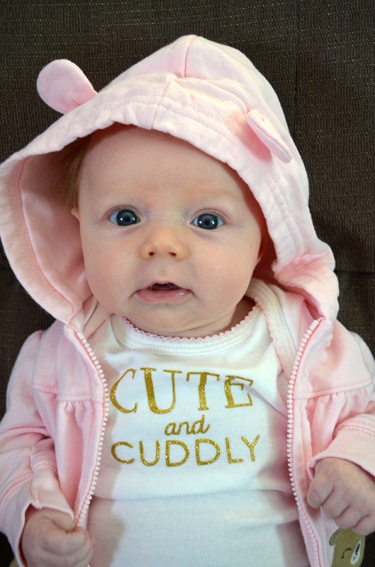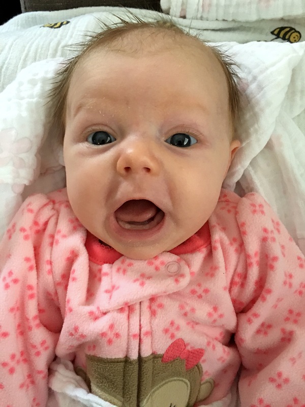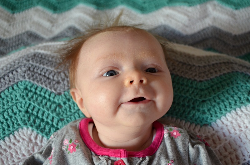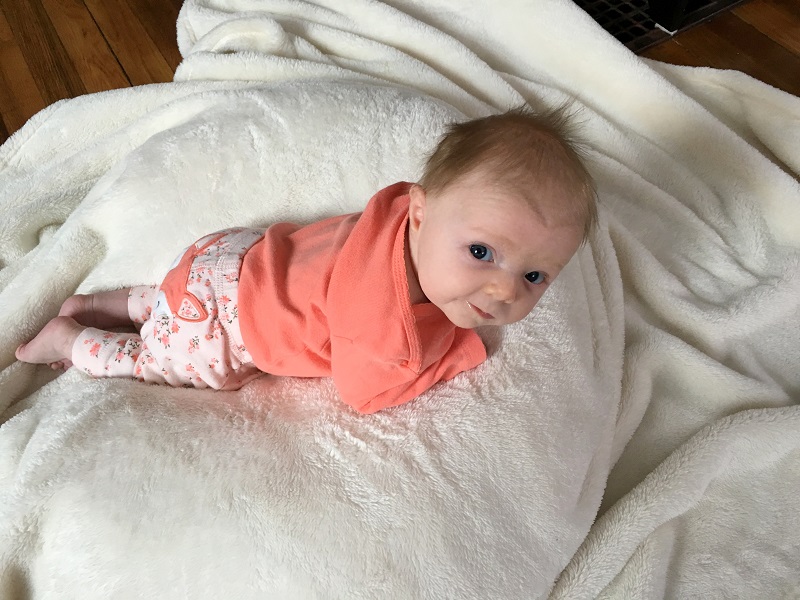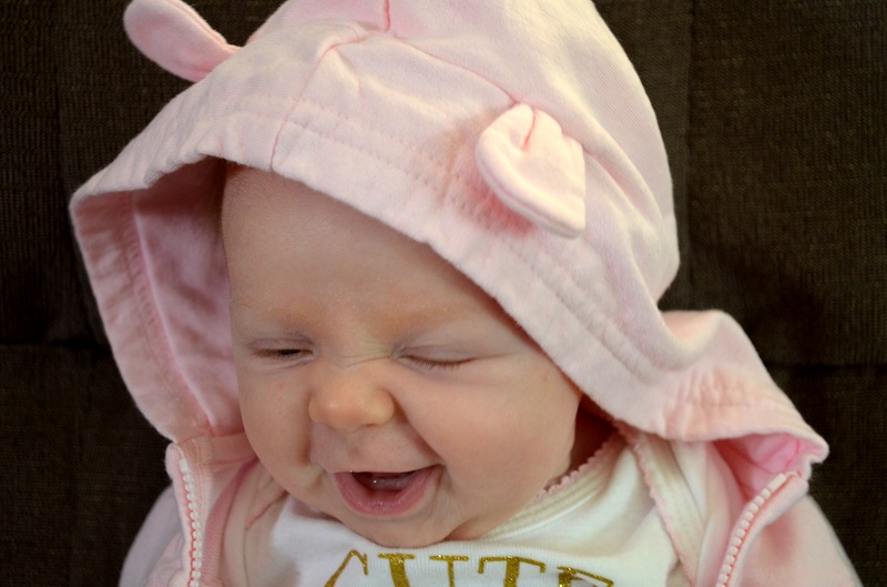 Temperament: She was pretty fussy at various times of the day for a lot of the month, but nothing major. She kind of just wants to be held all of the time, or laying on her changing table, and she’s happy. If she’s not fussy or sleeping, she’s smiling now. She still goes from 0-60 very quickly and cries SO HARD when she’s mad about something. Some of her cries have started to sound girly even – little screeches when she’s mad. And then she’s smiling again.