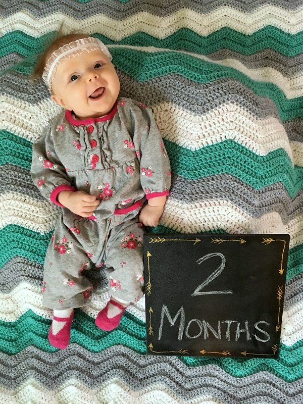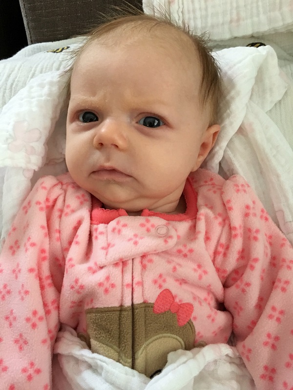 She was a bit fussy through the month and was spitting up more than usually. We thought she must have reflux like Jenson did, but it mostly tapered off since then. She started watching things more intently and reacting to us, so she’s becoming a “real person”, as Lo likes to say. She’s a happy baby for the most part, but she does want held as much as possible, and gets really mad, really fast if she doesn’t get that. Jenson liked a little more space when he was a baby. Sometimes she’s even picky about wanting us to stand while we hold her…sitting just won’t do. Girl just knows what she wants and she’s cute enough to get it.