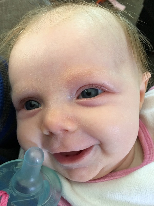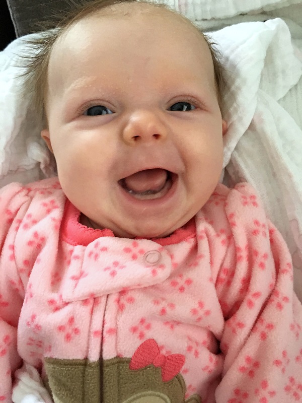 Teeth: None, thank goodness. Her bottom gums are bumpy, so it looks like teeth buds, but the Dr. said they aren’t.