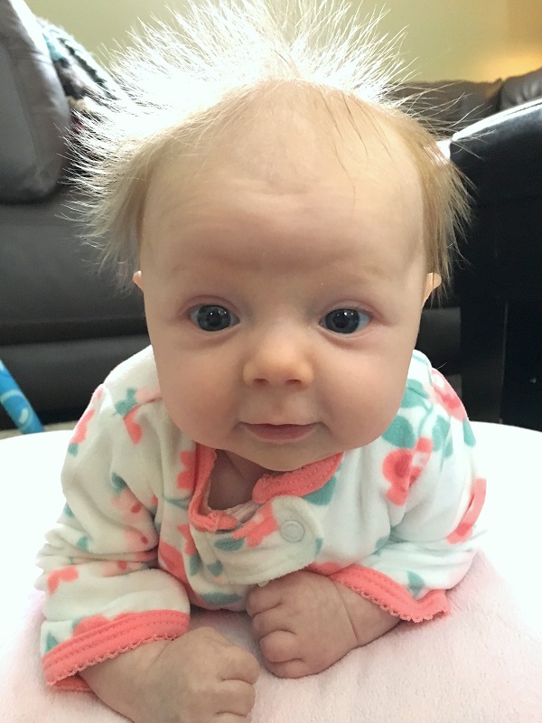 Hair: Light, baby bird hair that’s getting longer. It stands up all over the place still and is so fine. It’s mostly blond, but there is the slightest ginger tint to it, and her eyelashes are a coppery gold color (is that a color?).