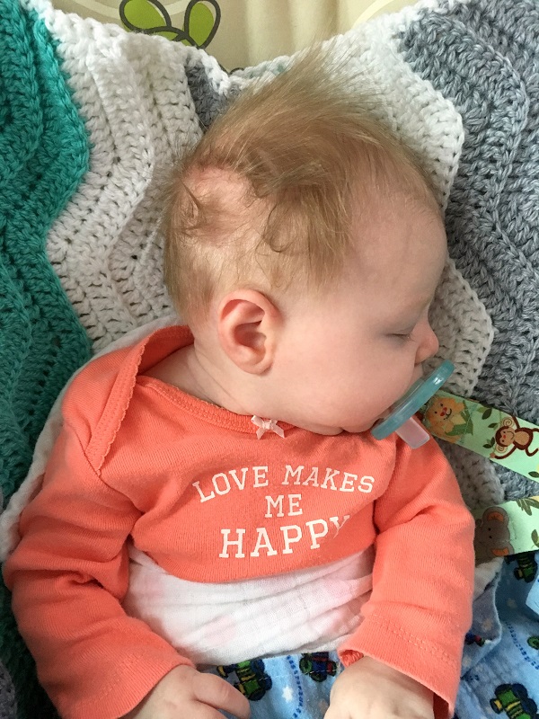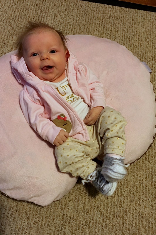 Sleeping: She’s a pretty great sleeper. She started sleeping 6-8 hours before she nurses at night, and then 2-3 from there. She’s usually in bed by about 9:30 pm. She’s grunty when she sleeps though. She sleeps in the rock-n-play in our room still and wears a HALO swaddle. During the day she doesn’t nap well unless she’s being held. She likes her swing and bouncer enough, but rarely sleeps in them. She still just catnaps between each meal for the most part; nothing longer than 45 minutes usually.