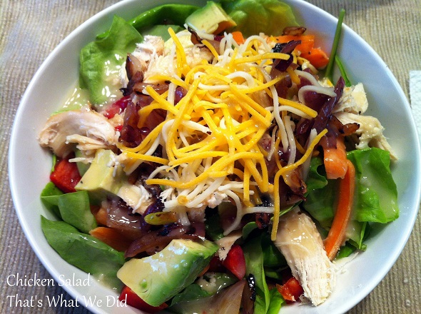 We had Chicken Salad with spinach, butter lettuce, shredded chicken, avocado, red peppers, carrots, cheese, and “55″ or “Double Nickel Dressing” (for lunch)