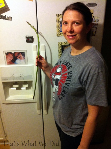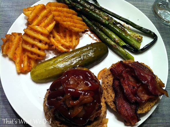 Tuesday: Burgers (I made a gluten free wonder bun for mine), Waffle Fries, and Asparagus. We had an enormously long asparagus that came up in the garden so Lo cooked that one on the grill and I roasted the rest in the oven. Half of the homegrown one was the tough inedible part, so it wasn’t as long as it looked.