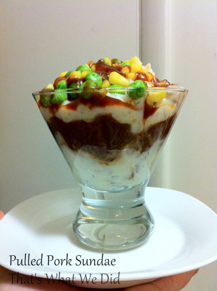 Dinner: Pulled pork and brisket sundaes! Our friends came over for dinner after they watched Boof for us during the day. The sundaes are made with mashed potatoes, topped with pork and/or brisket, BBQ sauce, mixed veggies (including green beans from the garden), cheese and bacon pieces. YUM. I got one at the State Fair a few years ago and loved it. I didn’t get a picture this time, but this is the first time I made them.