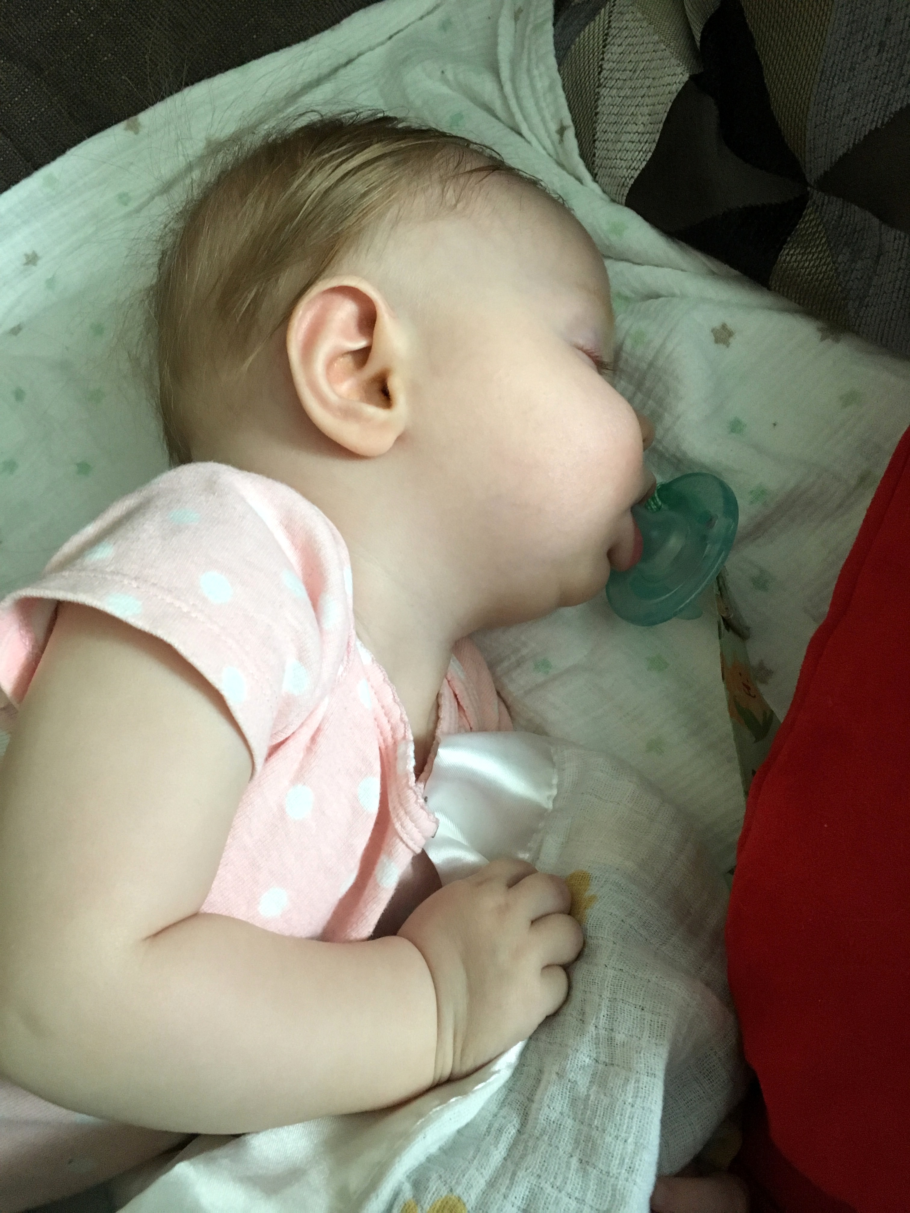 After his nap routine, I tried to pump on the right and got drops. It was such an awful feeling. I tried to feed her again and she was fussing and just seemed sleepy, so I laid down on the couch with her, and she snuggled up to my chest and fell asleep. She woke about 45 minutes later – barely – and I nursed her laying there. She got some milk from each side and fell back asleep. I was so relieved that she got some. But those hours of worry made me want to boost my supply and at least get a little stock in the freezer. She slept for over 2 hours off and on -which is kind of a record for her, and she nursed a little more again. She was able to get milk when she wanted, and was mostly happy through the day, so it’s safe to assume she’s not hungry.