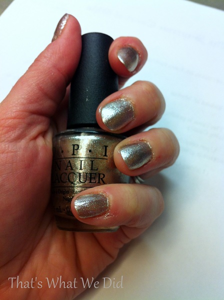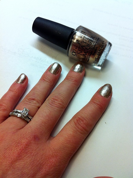 I decided I wanted something sparkly on my nails this week. Really, I just reached into my nail polish box and pulled out a couple of colors to choose between. OPI Designer…De Better, from the 2011 Holiday Muppet Collection was the winner. It’s definitely my favorite shimmery color and goes with anything. It’s a silvery-coppery-light gold color, depending on the light. I don’t see it available anywhere except in this Mini Muppettes four pack.