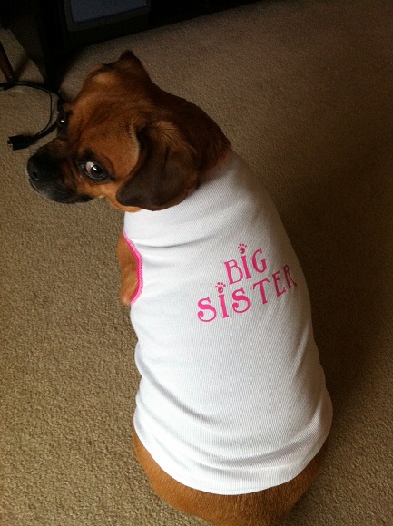 I’m not sure how thrilled Boof is going to be about the baby, but once he or she starts dropping food all over the place in about a year, she’ll get over it. We got this shirt for her to wear when we announced to my family. White ribbed shirts aren’t flattering on anyone, but as much as Lo swears she doesn’t like wearing clothes, she’d run over to me and sit down anytime I picked it up and she perfected her model pose immediately.