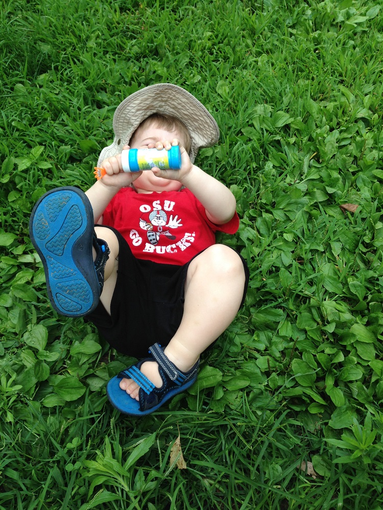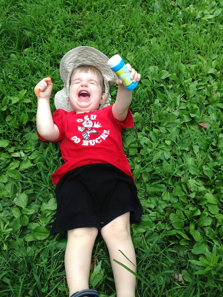 Lately, he’s been having a 4 p.m. witching hour, and I think it’s because he’s just ready for Lo to come home and get a break from me. The first day of this we were just playing outside – in the water, on the slide, blowing bubbles – all of which he loves, and he just laid down in the grass and started crying. He wasn’t hurt – I don’t even think he knew why he was crying. I picked him up twice and he wanted down and just laid back in the grass and continued. He fake-cried like this for about 15 minutes. I was talking to him the whole time, asking him if he wanted water, wanted to go outside the fence, wanted to go inside – all to which he replied very sadly “no”. Towards the end of this, he started crying with real tears, so I finally got him to go for a walk in the unfenced yard and he got over it. We went in and he had a snack and was back to being happy. Maybe he was just hangry.