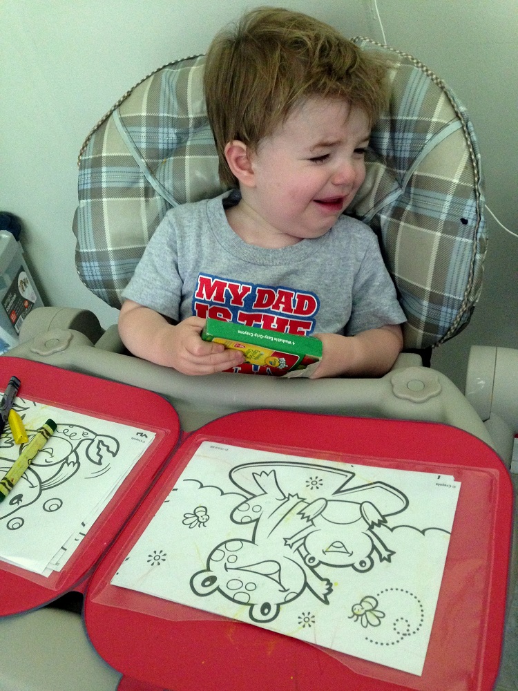 The next day he had his witching hour around the same time – he was getting whiny after we got home from being in Columbus, and he saw his crayons and decided he wanted to color. I put him in his highchair and gave him his crayons and wipeable coloring pad case. He was mostly fine, but he kept getting a broken crayon stuck horizontally in the box and would get really upset about it. He’d put his hand in the box and his hand would get “stuck” (except it really wasn’t), and he’d have a complete meltdown. He didn’t want me to help, but I’d finally take his hand out and dig out the broken yellow crayon and he’d be fine for 3 more minutes (repeat). Don’t even suggest that I just take away the broken crayon – there are only 4 crayons and he’s very concerned about having them all. If one falls into his lap or on the ground, he cries “Oh noooo, oh noooo” until I get the rogue crayon for him. To be fair, this is the day he was carsick in the morning, so who knows how he actually felt.