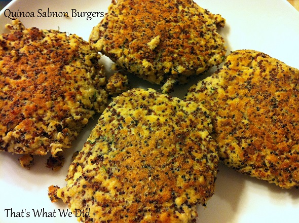 I recently rediscovered how much I like Salmon Burgers, or Salmon Patties, so when I saw a recipe that included quinoa and was naturally gluten-free, I couldn’t wait to try it. It’s pretty genius – mixing 2 superfoods in one simple recipe. I bought a 6 pack of canned Wild Alaskan Salmon at Costco a few months back, and I always have quinoa, so I was all set. This is a perfect recipe if you have leftover cooked quinoa – it freezes great, so I always make way more quinoa than I need and freeze most of it. If you don’t already have it cooked, it only takes 20 minutes, so it’s still going to be quick.