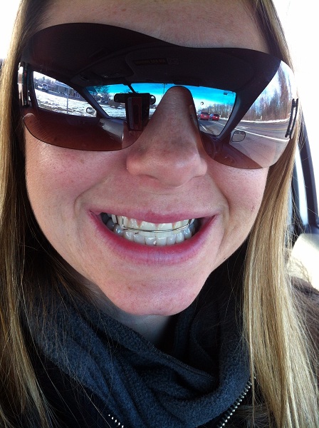 As odd as it sounds, I don’t mind that they make my teeth sore. It sounds weird, but I used to like getting my braces tightened and how it would make my teeth sore. What I don’t like is how I can’t talk when I’m wearing them. Lo can never understand me. Luckily I don’t have to wear it at work or in public. I got the retainers on my friend’s birthday, so I sent him this pic to wish him a happy birthday. He has to wear retainers too, so he knows how lucky I am. I’m so glad the snow (from the reflection in my sunglasses) has melted. It was a beautiful coat-less weekend in January.