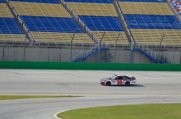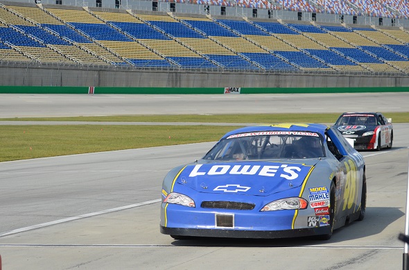 Both of them coming around a lap before Lo makes a pass. He said he almost got black-flagged by his spotter for passing when he wasn’t supposed to, but he couldn’t hear what the guy said (they both had trouble hearing the radio communication), and didn’t realize he was in the wrong. He also didn’t hear him tell him to pit at the end on the backside of the track and had to pit on the front side. I’m sure his spotter was thrilled with him, but they should have better radio systems.