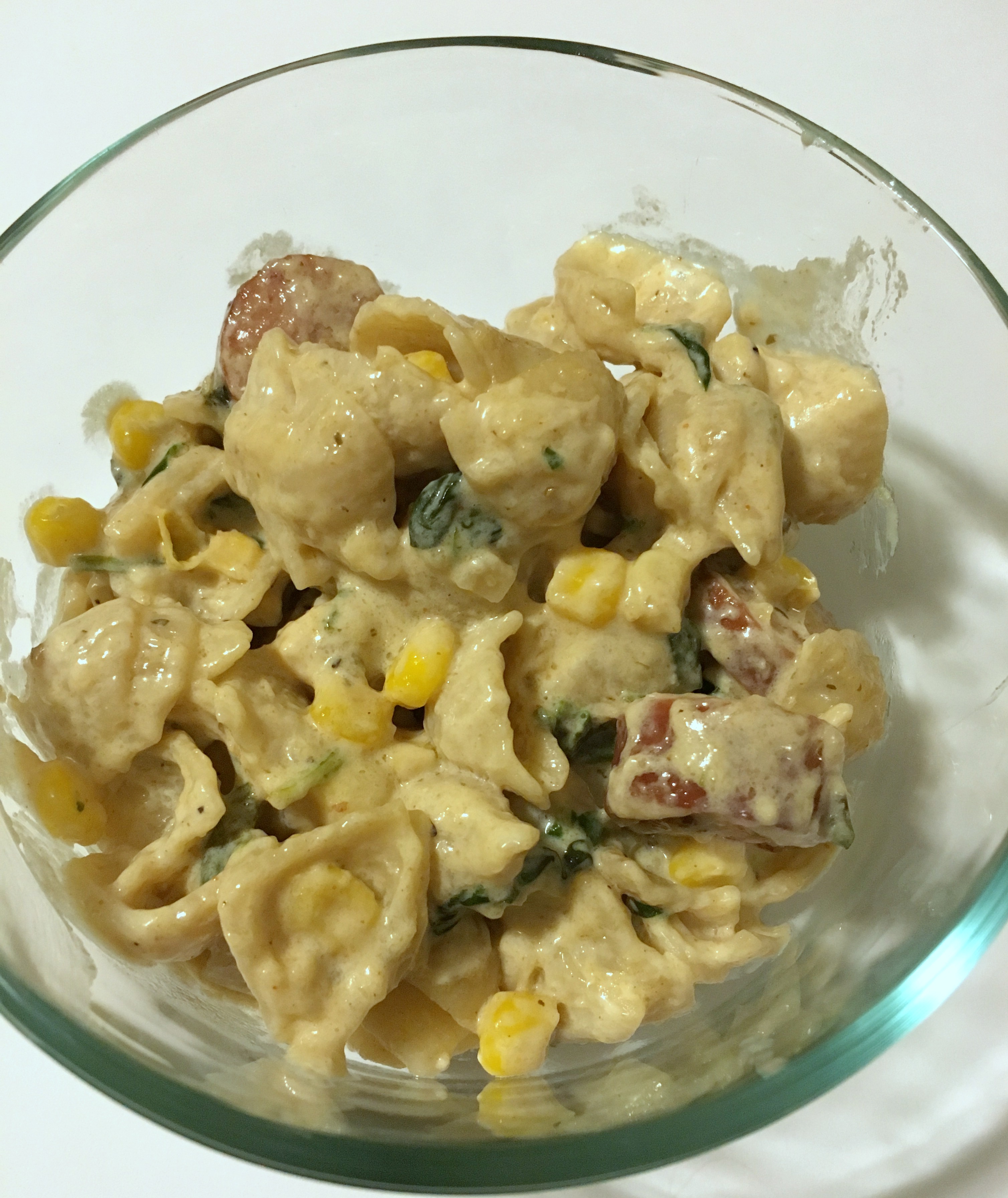 On one of my last grocery shopping trips before Marlowe was born, I grabbed a few packages of kielbasa and smoked sausages because they are easy. Luckily these are good in the fridge for awhile, because I kind of forgot about them. I was flipping through a magazine one day (you know, because I have so much leisure time these days) and saw a recipe from Hillshire Farm for Sausage Alfredo. It looked good, and I had enough of the ingredients to make it work in my own way, so I pulled it out and forgot about it for a few weeks. I kept moving the piece of paper around until I finally decided to just make it. I wasn’t sure it was going to be very good, and I didn’t like Lo liked alfredo stuff much, but I wanted to try it out. It was actually really good and Lo liked it too. It’s certainly not a very healthy meal, but I would make it again in the future because it was so easy. Not the prettiest photo, but when you only have moments to spare before the baby is hungry again, plating isn’t a priority – you just need the food in your belly.