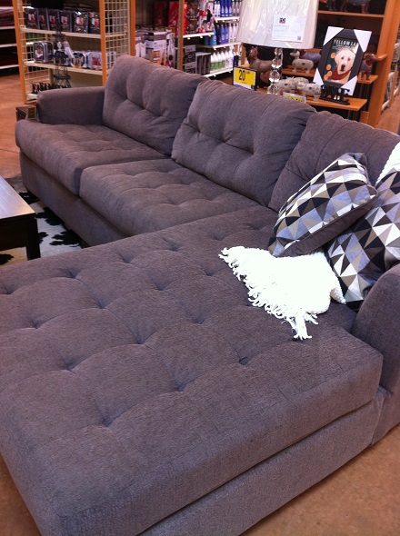 - We bought a couch at Kroger this week, lol. Yes, the grocery store. We wanted to replace the couch that we’ve had since we moved in together (it was free from a friend, but a great couch) because we wanted a sectional, but haven’t had luck finding one we want. I saw this one in the ad and it was 1/2 price and the perfect configuration, so we checked it out and really liked it. It will be perfect for the basement if we decide we want something different at some point. It’s Ashley furniture, so it should hold up well and we already Scotchguarded it. Here it is: (in the store)