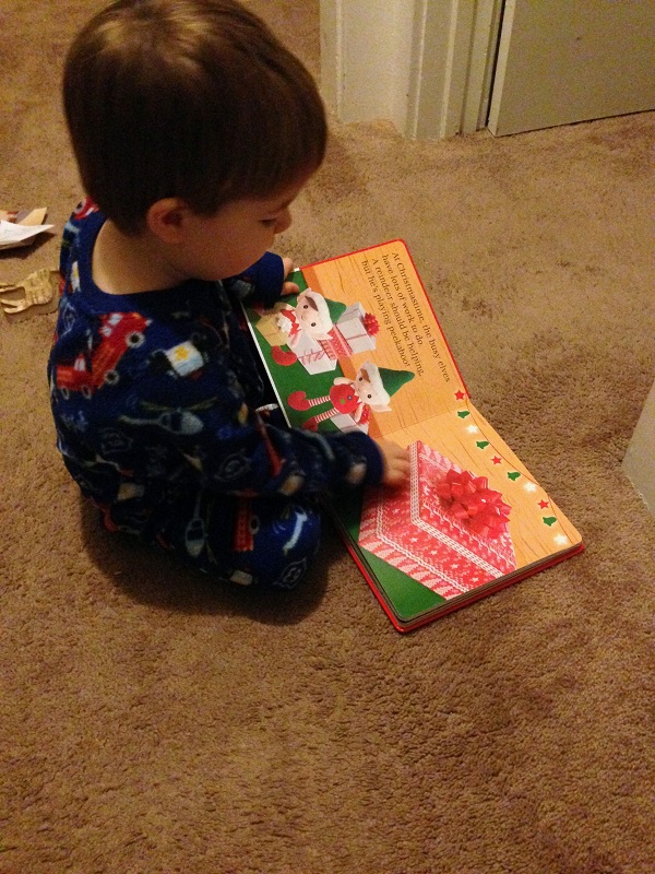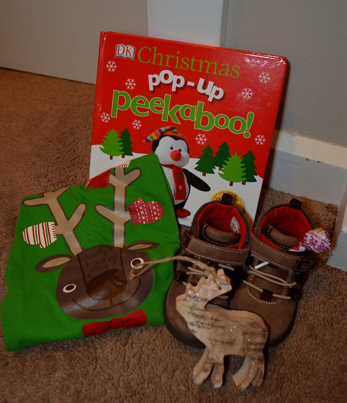 I’ve decided it’s the perfect time to give him Christmas jammies or a shirt each year so that he can get plenty of wear from them during the holiday season, plus a Christmas book. This year I also gave him his Christmas ornament – a reindeer to represent all of the deer we see at our new house, and I threw in a sucker because that’s his favorite candy – it’s supposed to be a candy cane as mentioned above, but I didn’t have any and he wouldn’t probably eat it anyway.