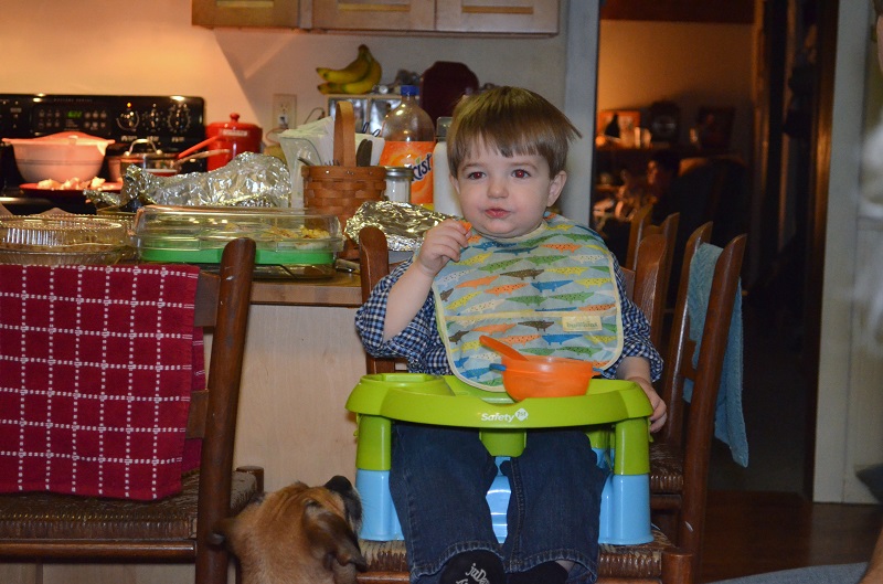 Eating thanksgiving food, which probably just consisted of a roll, mashed potatoes, mac and cheese, and fruit for him. I don’t really remember what he ate. He did eat one candied carrot because we called it a “pie carrot”. He said he liked it but wouldn’t eat another.