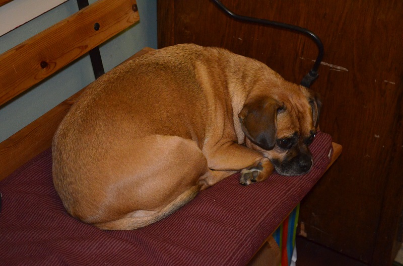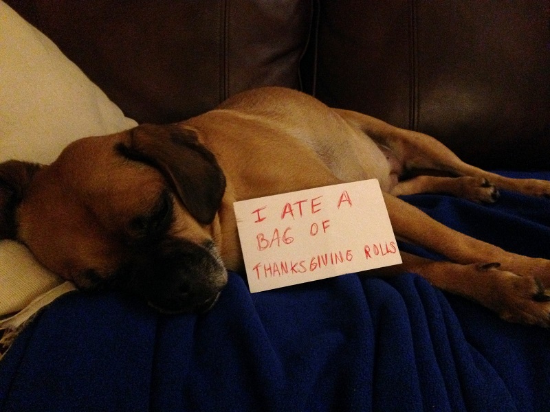 While we were at the game, Boof helped herself to a bag of Thanksgiving rolls that were in a bag just alittle too close to the edge of the table. My mom underestimated her athleticism. As soon as we walked in the door, I knew she ate something she wasn’t supposed to. She’s so obvious when she does something wrong. She’s extra excited and barky. I immediately started looking around and saw the bag for the rolls on the floor. Funny thing is that she stashed at least one elsewhere in the house. While I was putting Jenson to bed, she came in the room and was rooting around and ran downstairs with a roll in her mouth. Lo was able to grab it from her, so she probably only ate 11 mini-rolls, instead of 12. She was a little sluggish for the rest of the night, and even my dad refrained from sharing all of his food with her for the next day or two because of her overindulgence. We called her “biscuit” for the rest of the weekend.