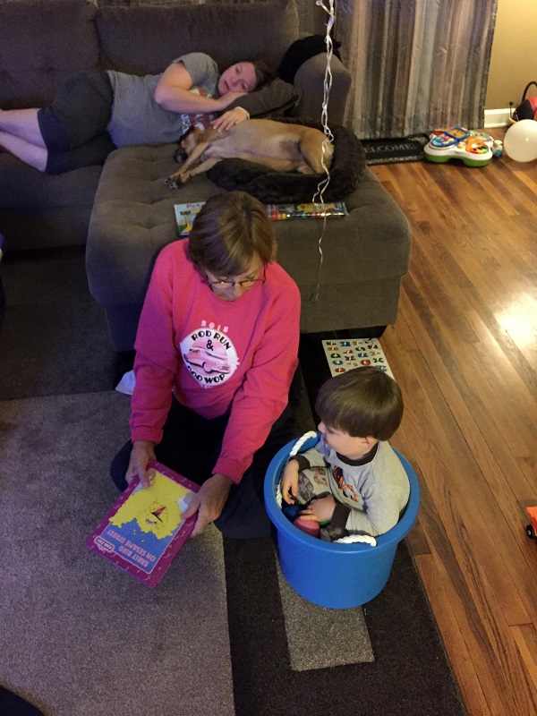 Jenson has always been fond of my nieces, Emma and Lydia. They live just a few miles from my parent’s house, so they get a lot of time with him when we are home. But after they came to his birthday party, he became absolutely obsessed with them. They (and my sister/brother-in-law and parents) stayed the night after the party and all evening until bed he was constantly yelling “Emma!” “Lydia!”, which sounded more like “AMMA, Leeedia!”, trying to get their attention (eventually this merged to EmmaLydia). Emma couldn’t be out of his sight without him yelling for her. At some point that night or the next morning, Lydia fixed one of his balloons (not sure what she fixed, but maybe the string came undone?) and every time he looked at his balloons for weeks (until they deflated), he’d say “Lydia fixed balloons”.