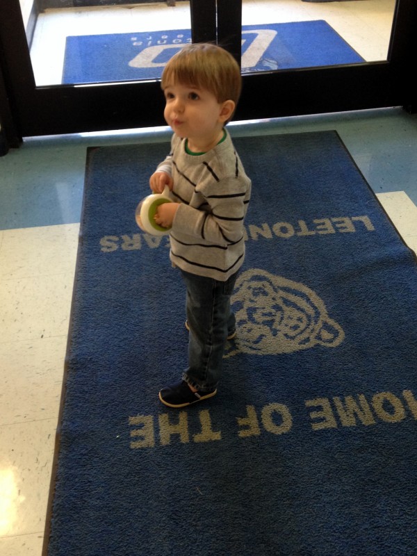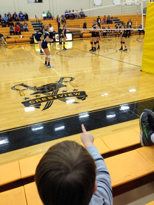 The plan was to go to Lydia’s volleyball game on Wednesday night, and part of each of Gannon’s football and Emma’s volleyball game on Thursday, and then head home on Friday for Jenson’s 2 year appointment. Lydia’s game got cancelled on Wednesday (and unfortunately rescheduled for the same time as Emma’s game on Thursday), and then my mom and I had to take food over to feed Gannon’s football team after school 2 hours before the game. He had fun and the boys on the team made a fuss over him. I didn’t get any pictures of him with Gannon bc I didn’t want to embarrass Gannon in front of his friends – he’s at that age now. He walked all through the school, which connects to the elementary school and the kids were just getting done for the day. He loved seeing them and was saying hi as we headed back to the middle school. He got to see his cousin Brady’s football practice for a few minutes too – except neither of them knew that the other was there, so he was just watching random people practice football.