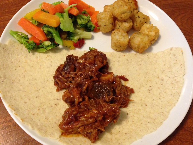 We threw some tater tots in the oven, heated up the pulled pork, and microwaved some frozen vegetables. I wrapped mine in 1/2 of a gluten-free wrap, while Lo ate his on bread or a bun (I didn’t pay attention). Fancy birthday dinner, right? Doesn’t matter…it was good. The pork was super tasty – tender and meaty…with a thick sweet BBQ sauce that stuck to it. I’ve had ready-to-eat pulled pork before and the container had more sauce than meat in that brand, but that wasn’t the case this time. It was definitely pork with sauce, instead of sauce with pork. I get grossed out easily if I bite into gristle or something other than what I’m expecting when I’m eating meat, and I didn’t encounter any of that either. There was enough for 4 servings, so we happily had it the next day too. I would definitely buy this again – and maybe try the another variety like Tony Roma’s Kansas City Style Kickin’ Sweet & Spicy Pulled Pork. I love that I can keep these in my fridge for several weeks, or freeze them until I need a meal.