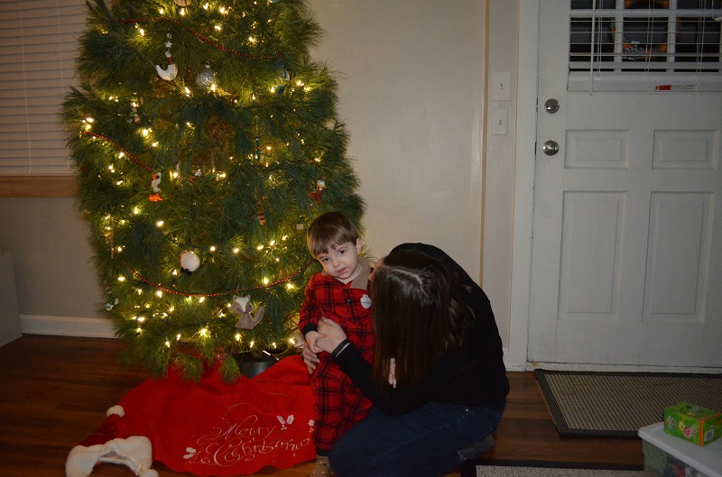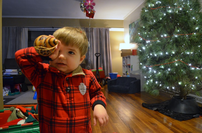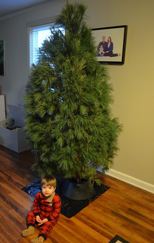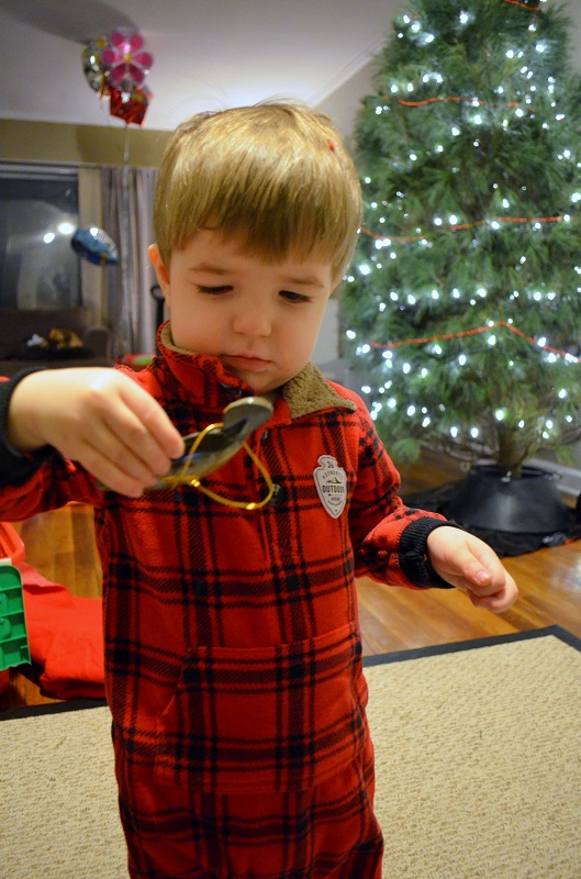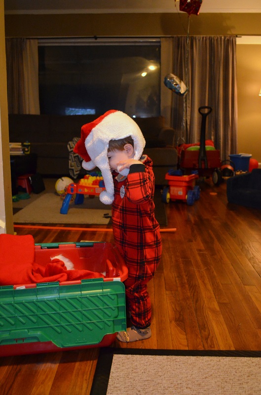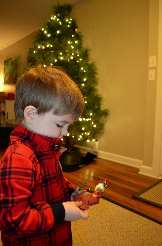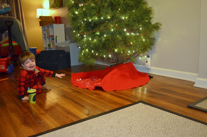 At some point, he decided that everything in that box was his…and he kept sorting the hats, ornaments, and tree skirt. So when we took the tree skirt to put it around the tree, he freaked. He cried for about 5 minutes about wanting it “have it, have it”, until Lo finally convinced him to put a hat on the top of the tree to distract him. After that, he was totally fine with the tree skirt being around the tree and hasn’t bothered it since.
