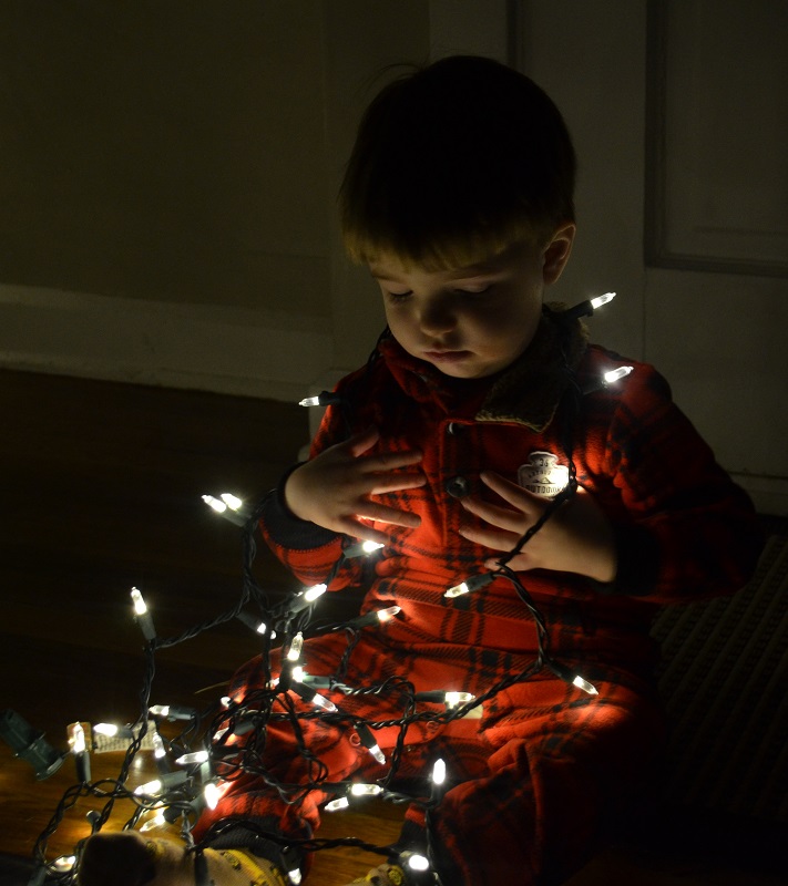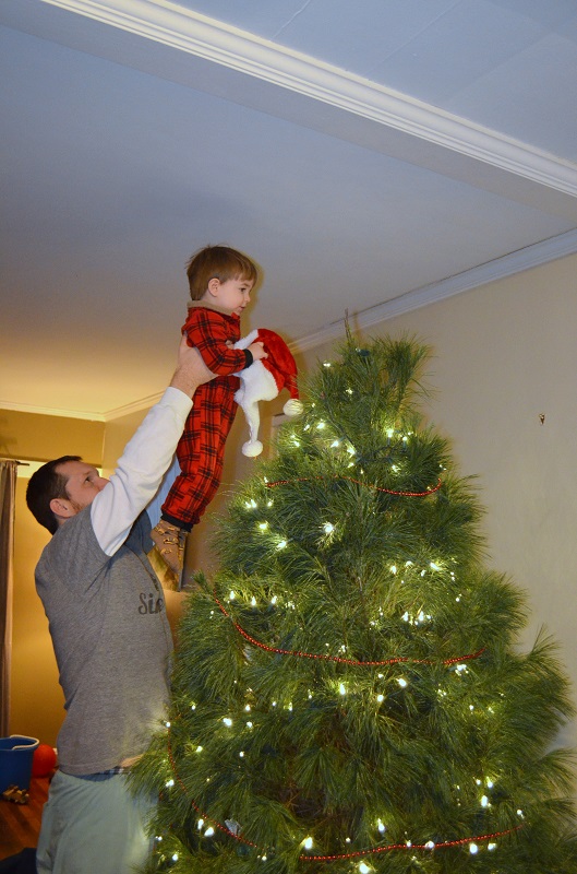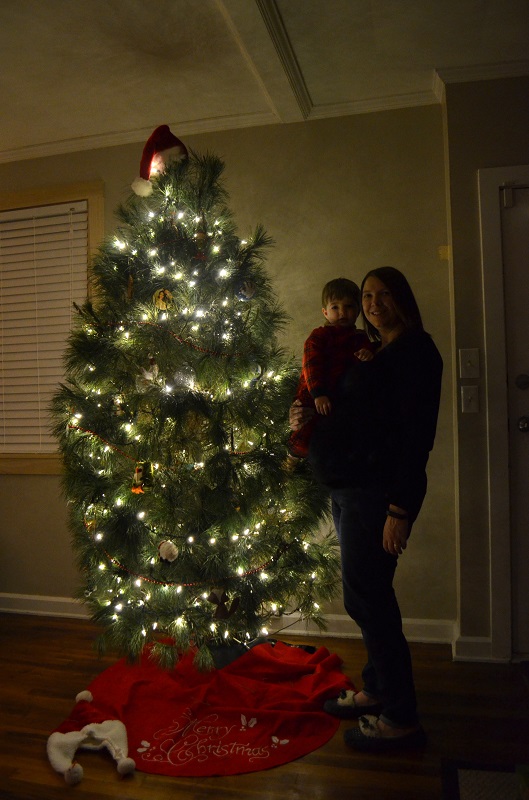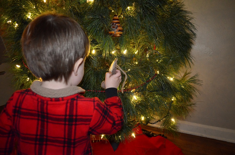 Then it was time for ornaments, with breakable ones strategically towards the top of the tree (and the tree is secured to the wall). He really hasn’t bothered the ornaments anyway. He’ll touch them sometimes or say something about them, but I don’t think he’s even taken one off the tree. He’s pretty well-behaved like that, which leads me to believe that this next baby is going to be a real stinker.